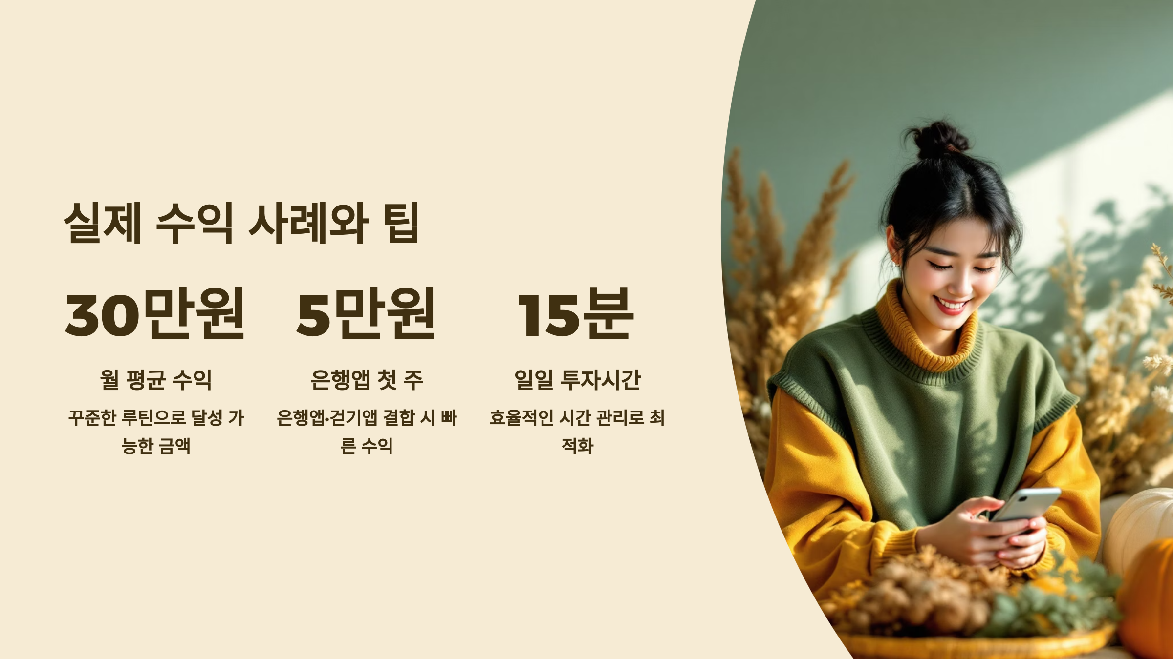 30대 주부 박모씨의 경우는 육아와 가사일을 하면서도 월 12만원 정도의 수익을 올리고 있어요. 그녀의 전략은 '자투리 시간 활용법'이에요. 아이가 낮잠을 자는 시간, 세탁기가 돌아가는 시간, 요리를 하면서 기다리는 시간 등을 모두 앱테크에 활용하는 거죠. 특히 요리 관련 앱들을 통해 레시피를 공유하고 후기를 작성하면서 추가 수익을 얻고 있어요. 또한 아이와 함께 교육용 앱을 사용하면서 학습 보상도 받고 있답니다.