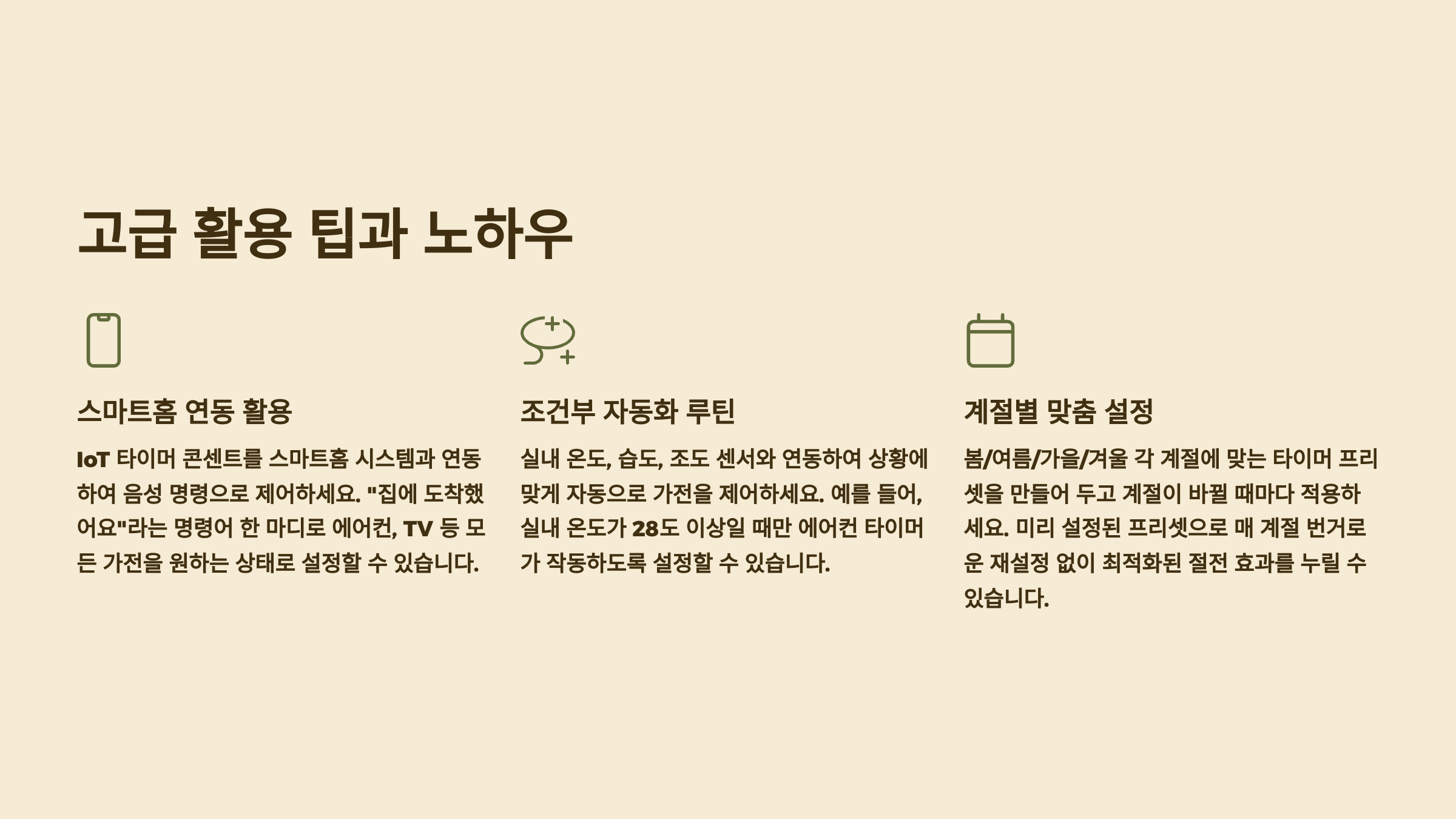 | 06:00~09:00 | 정수기, 커피머신 | 전기장판, 가습기 | 아침 루틴 자동화 |