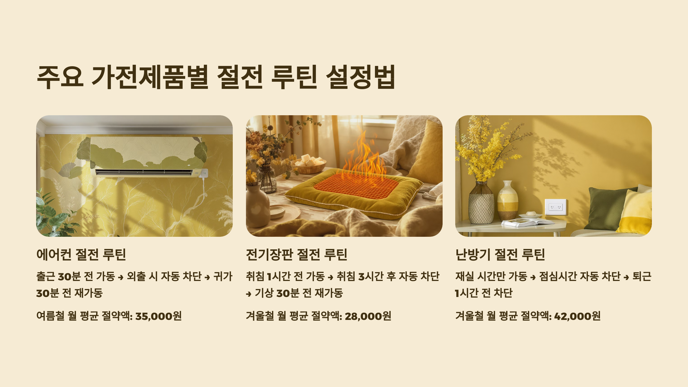 | 09:00~18:00 | 최소 필수 가전만 | TV, 컴퓨터, 공기청정기 | 외출 시 완전 차단 |