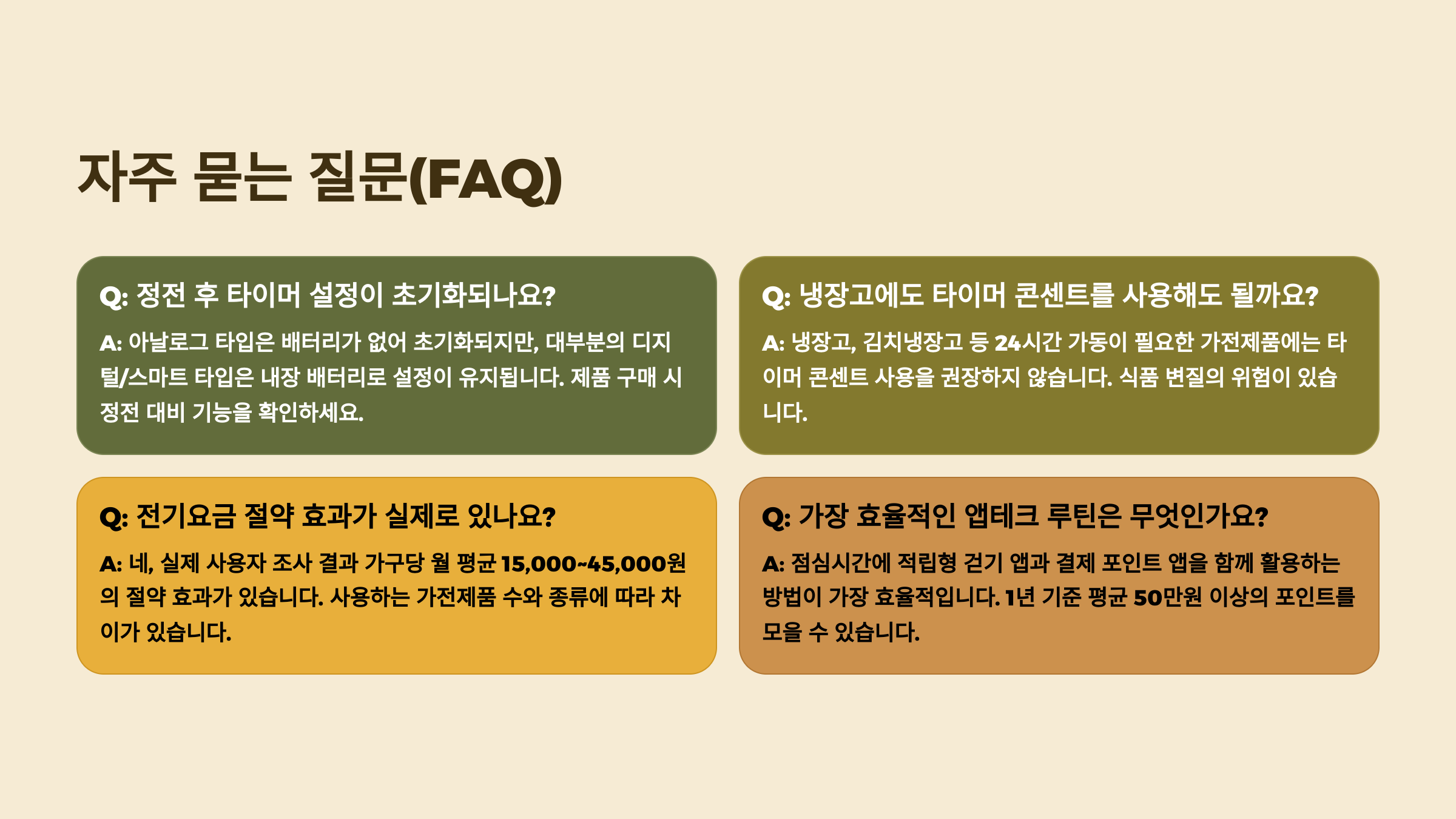 타이머 콘센트는 작은 투자로 큰 절약 효과를 얻을 수 있는 스마트한 절전 도구예요. 대기전력 차단만으로도 월 3-5만원의 전기요금을 절약할 수 있고, 누진제 구간을 낮춰 추가 절약도 가능하답니다. 게다가 화재 예방과 편의성까지 더해져 현대 가정의 필수품이 되고 있어요. 지금 바로 시작해보는 것은 어떨까요? 🌟