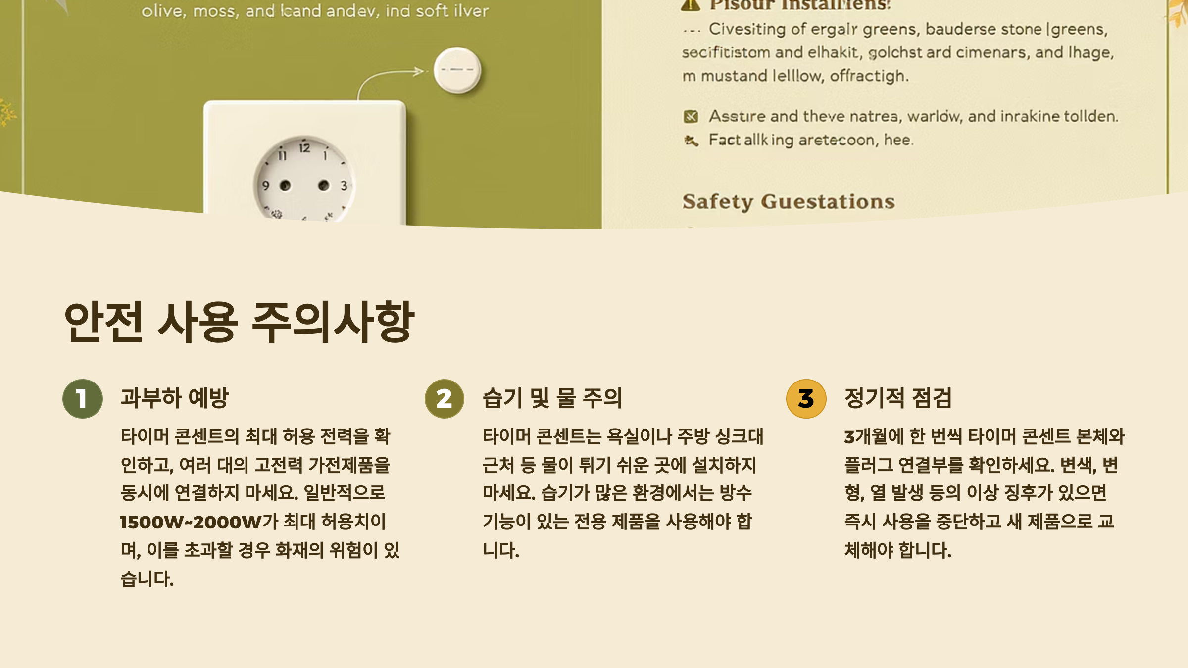 A4. 고전력 제품은 16A(3,520W) 이상의 대용량 타이머 콘센트를 사용해야 해요. 일반 10A 제품에 연결하면 과열로 인한 화재 위험이 있어요. 제품 구매 시 반드시 정격용량을 확인하고 여유 있게 선택하세요.
