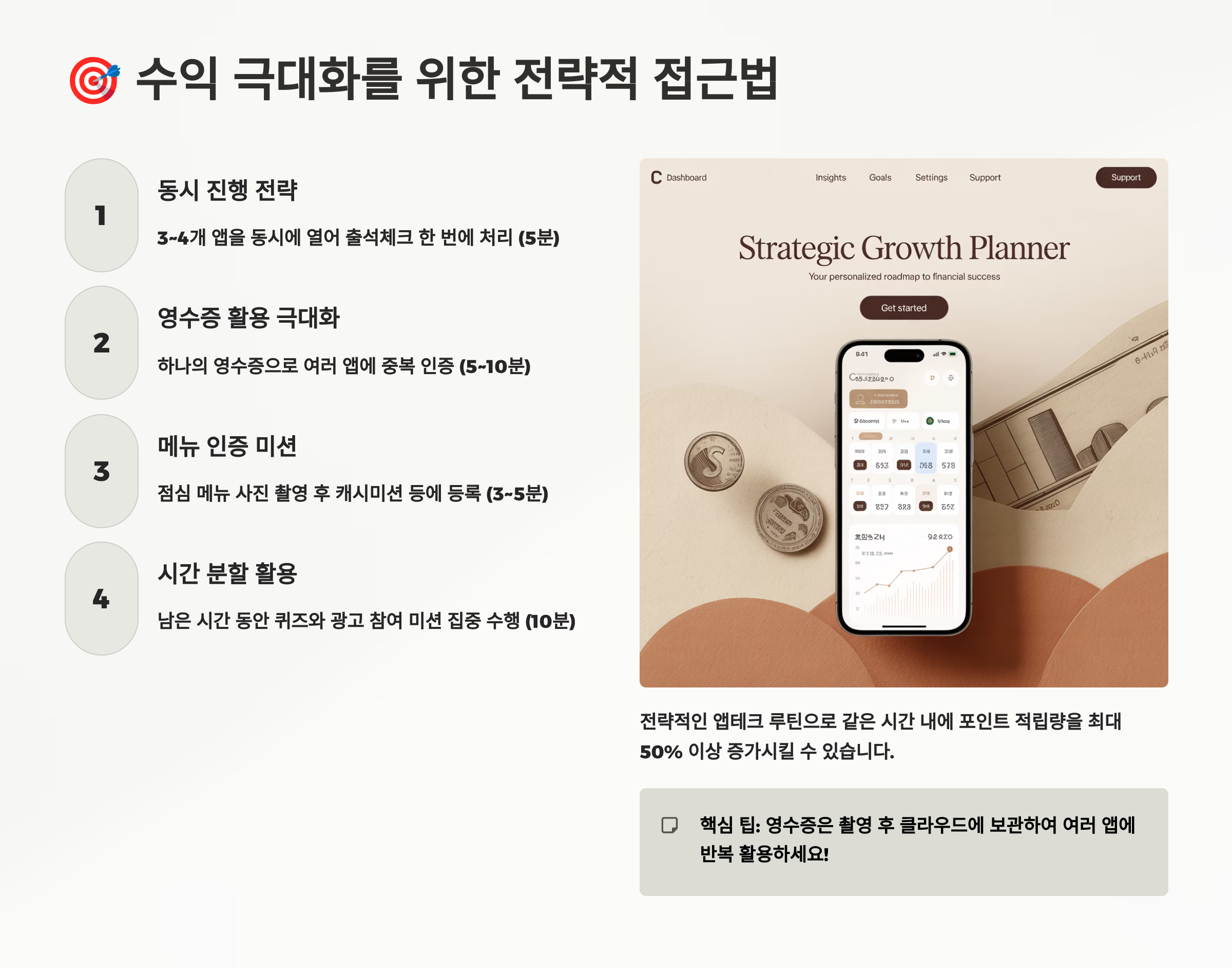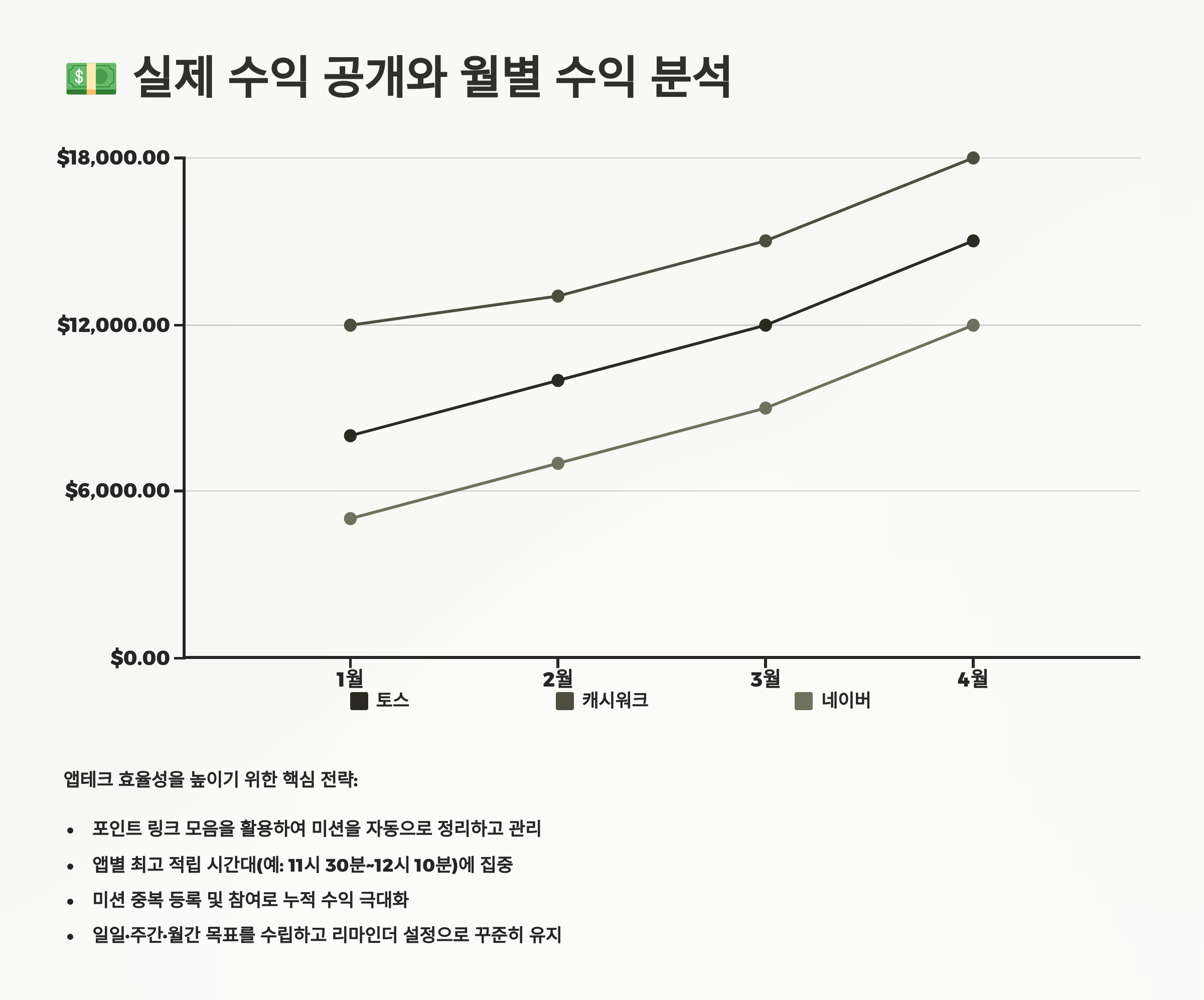 앱테크도 전략이 필요해요! 무작정 많은 앱을 설치하고 이것저것 하는 것보다, 체계적인 전략을 세워서 접근하면 같은 시간을 투자해도 2~3배 더 많은 수익을 올릴 수 있어요. 제가 직접 실험하고 검증한 수익 극대화 전략들을 모두 공개할게요. 이 전략들을 활용하면 월 20만원 이상도 충분히 가능해요! 🚀