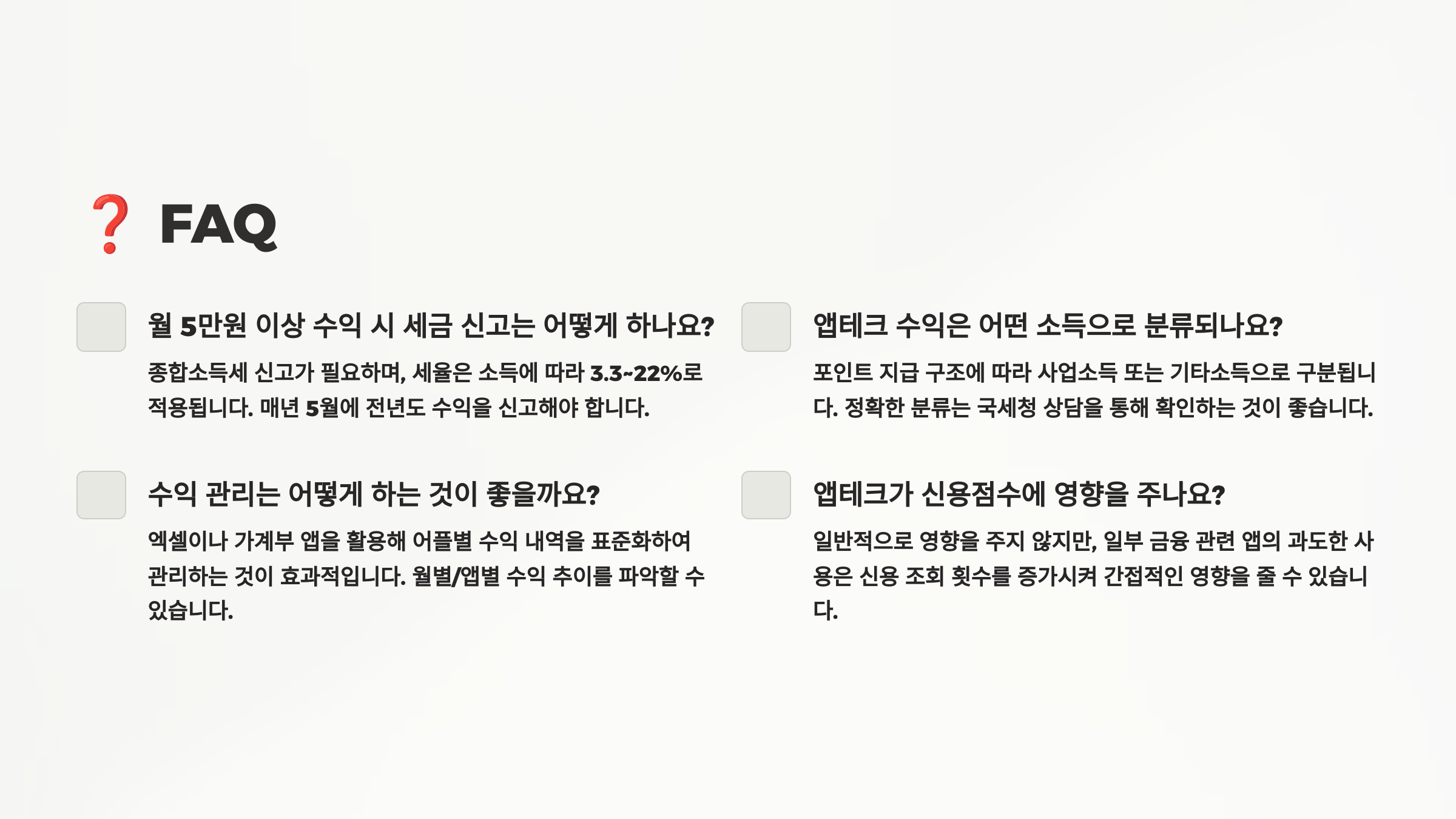 본 글은 개인의 경험을 바탕으로 작성된 정보성 콘텐츠입니다. 앱테크 수익은 개인의 노력과 상황에 따라 다를 수 있으며, 제시된 수익을 보장하지 않습니다. 앱 이용 시 약관을 확인하고, 개인정보 보호에 주의하시기 바랍니다. 세금 관련 내용은 참고용이며, 정확한 내용은 세무 전문가와 상담하시기 바랍니다.