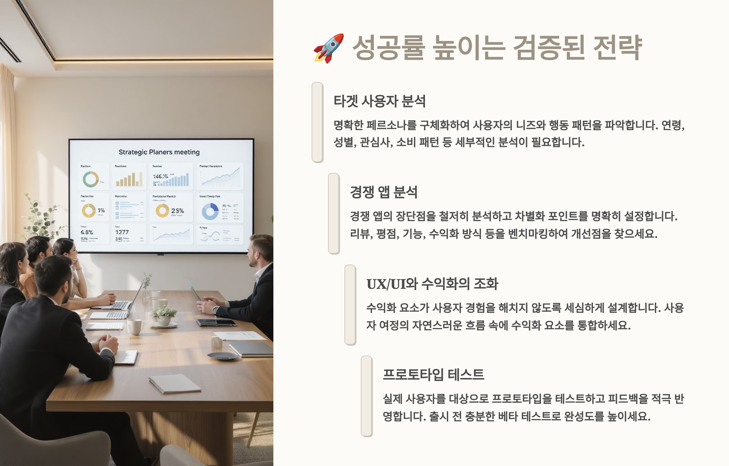 경쟁력 분석도 빼놓을 수 없어요. 유사한 앱들이 어떤 수익 모델을 사용하는지, 어떤 기능이 인기 있는지 파악해야 해요. 단순히 따라하는 것이 아니라 차별화 포인트를 찾는 것이 중요하죠. 시장 포화도도 고려해야 해요. 레드오션에서는 독특한 가치 제안 없이는 성공하기 어려워요. 철저한 준비가 성공의 지름길이랍니다! 🎯