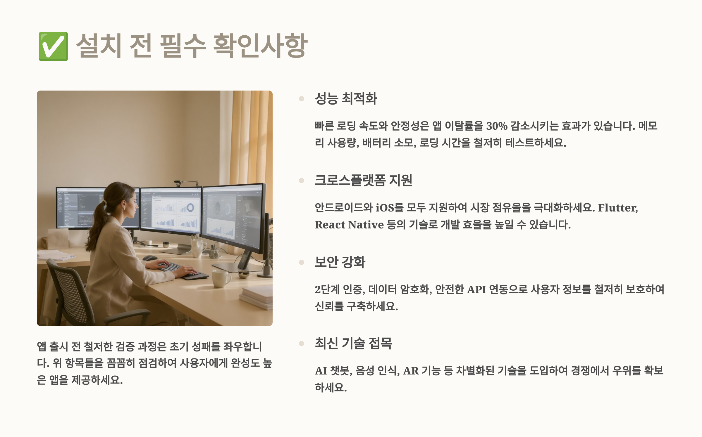 앱을 설치하기 전에 반드시 확인해야 할 사항들이 있어요. 먼저 수익화 준비도를 점검해야 해요. 앱이 해결하는 핵심 문제가 명확한지, 타겟 사용자가 누구인지 정확히 정의되어 있는지 확인하세요. 막연하게 '모든 사람'을 대상으로 하는 앱은 성공하기 어려워요. 구체적인 페르소나를 설정하고 그들의 니즈를 파악하는 것이 중요하죠.