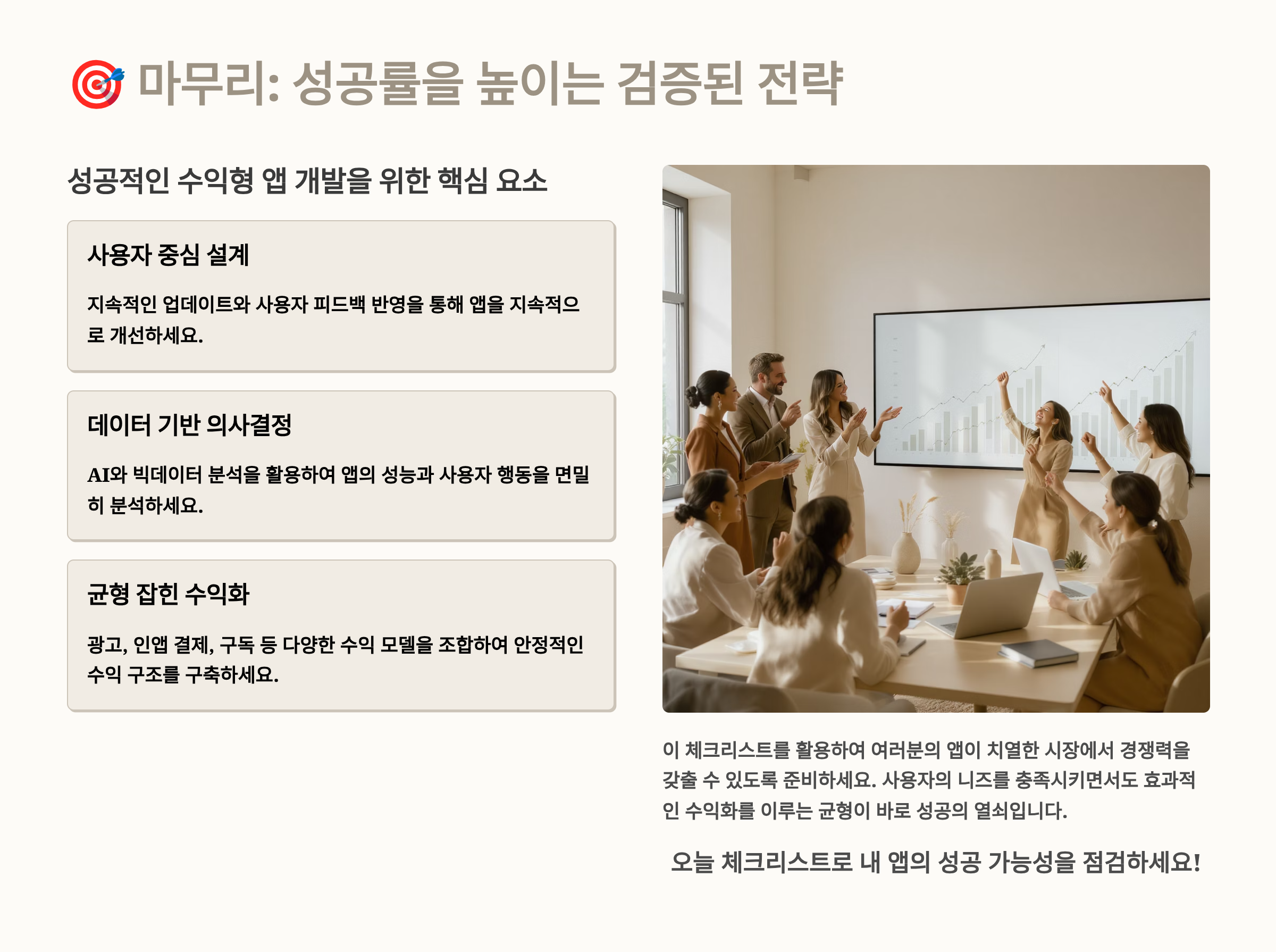 가장 중요한 것은 사용자 중심의 사고예요. 아무리 좋은 수익 모델도 사용자가 만족하지 않으면 지속가능하지 않아요. 사용자에게 진정한 가치를 제공하면서도 수익을 창출하는 균형점을 찾는 것이 핵심이랍니다. 꾸준한 개선과 혁신을 통해 사용자와 함께 성장하는 앱을 만들어보세요.