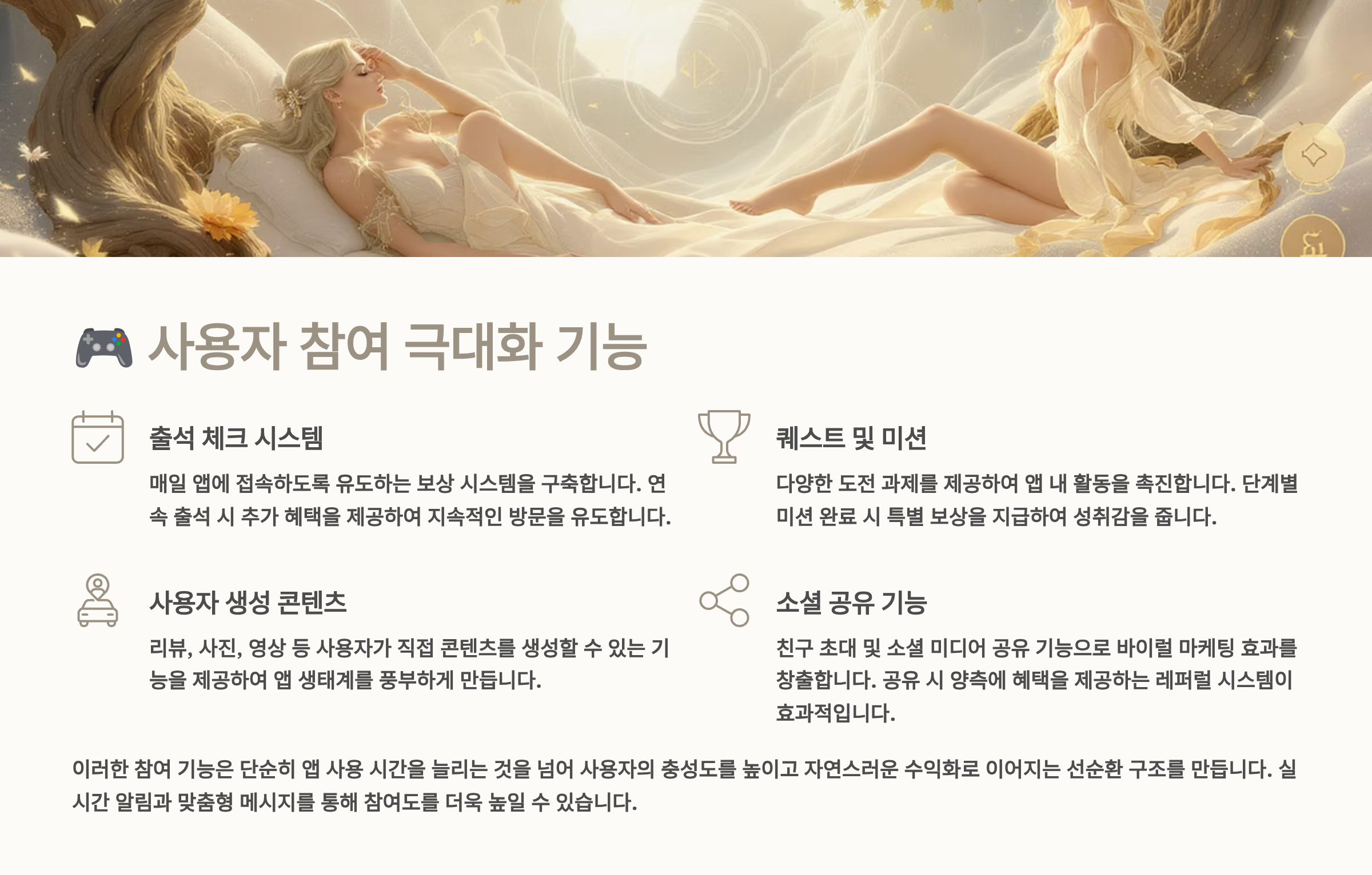 사용자 참여도는 앱의 생명력을 결정짓는 핵심 지표예요. 게임화 요소를 도입하면 사용자들이 앱을 더 자주, 더 오래 사용하게 만들 수 있죠. 출석 체크 시스템은 가장 기본적이면서도 효과적인 방법이에요. 매일 방문할 때마다 포인트나 보상을 제공하면 일일 활성 사용자(DAU)가 크게 증가한답니다.