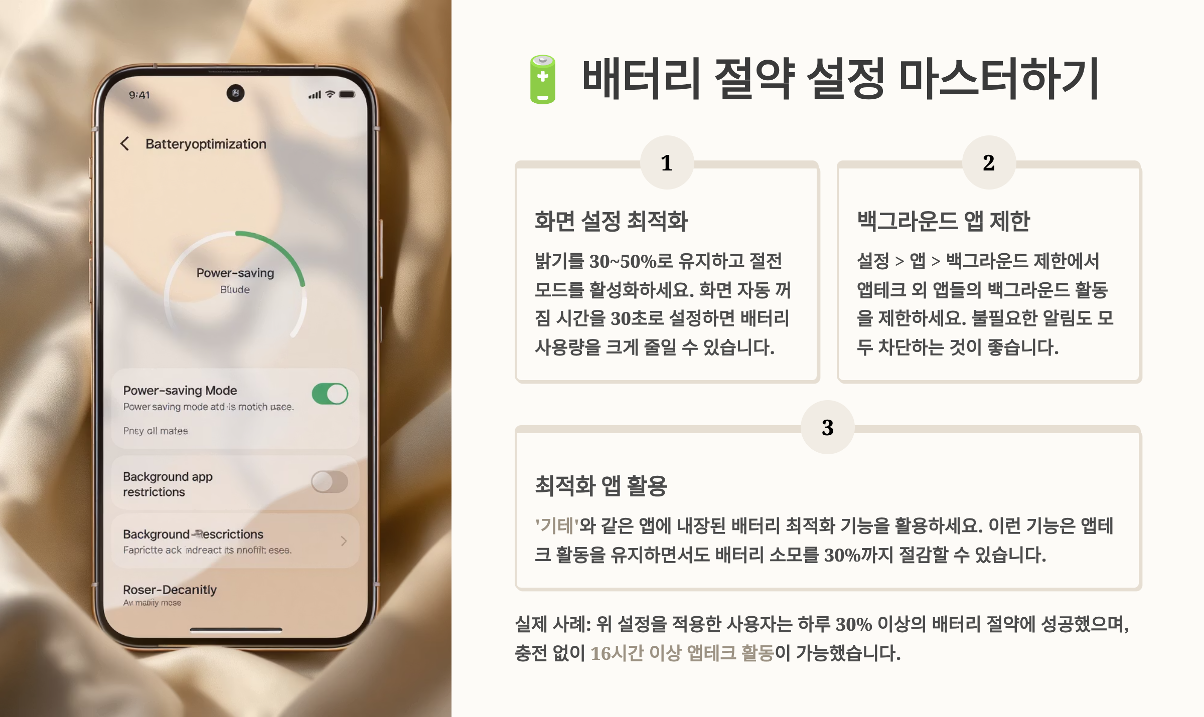 앱테크의 가장 큰 적은 바로 배터리 소모예요! 🔋 하루 종일 앱을 돌리다 보면 배터리가 금세 바닥나죠. 하지만 제가 알려드리는 설정법을 따라 하면 배터리 사용 시간을 2배 이상 늘릴 수 있어요. 실제로 저는 이 방법으로 하루 한 번 충전으로도 충분하게 사용하고 있답니다!