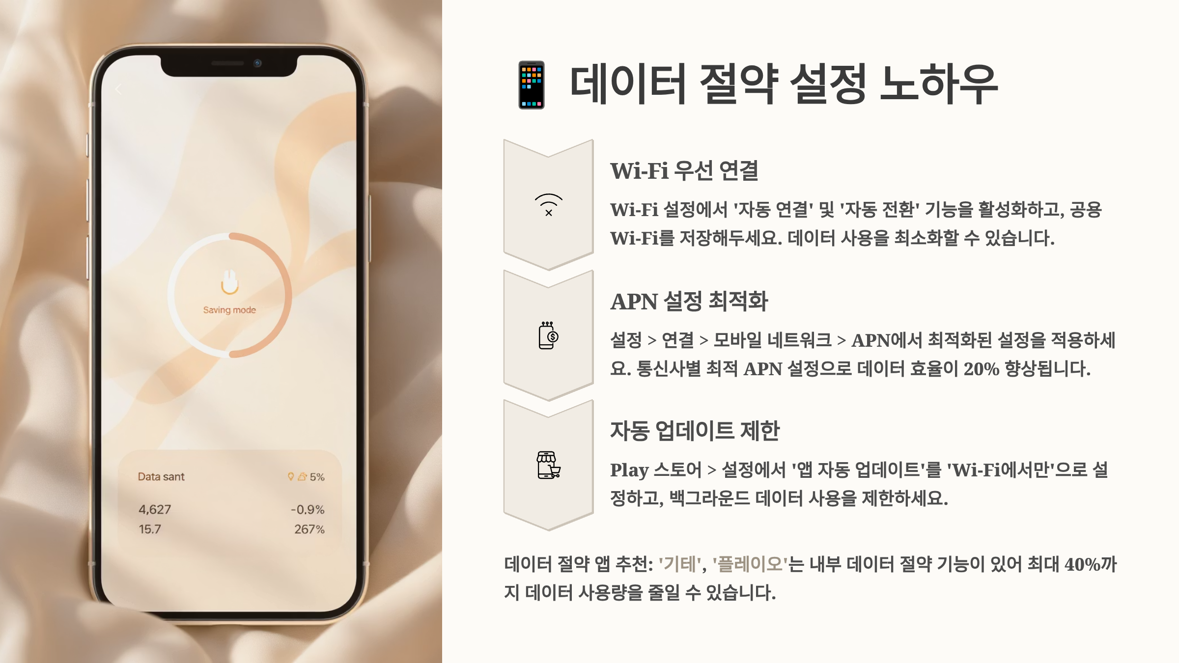 데이터 절약 모드는 기본 중의 기본이에요! 📊 안드로이드는 설정 > 연결 > 데이터 사용량 > 데이터 절약 모드를 켜세요. 삼성은 '데이터 절약 모드', 구글은 '데이터 세이버'라고 불러요. 이 기능만 켜도 데이터 사용량이 30% 이상 줄어든답니다!