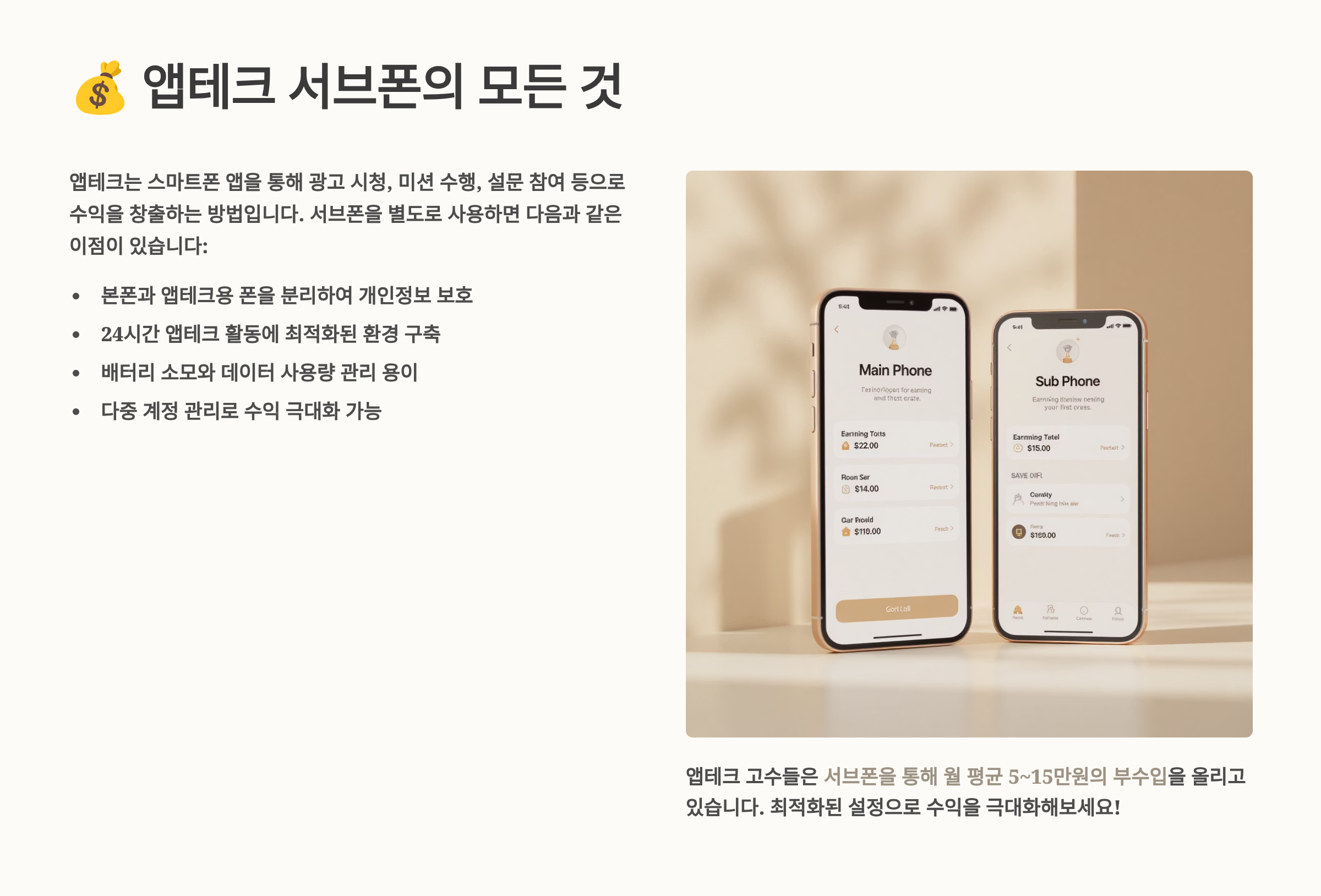 앱테크로 부수입을 만들고 싶은데 어떻게 시작해야 할지 막막하신가요? 😊 저도 처음엔 그랬어요. 하지만 서브폰을 제대로 설정하고 나니 월 30만원 이상의 안정적인 부수입을 만들 수 있었답니다! 오늘은 제가 직접 경험하며 터득한 앱테크 서브폰 최적 설정법을 모두 공개할게요!