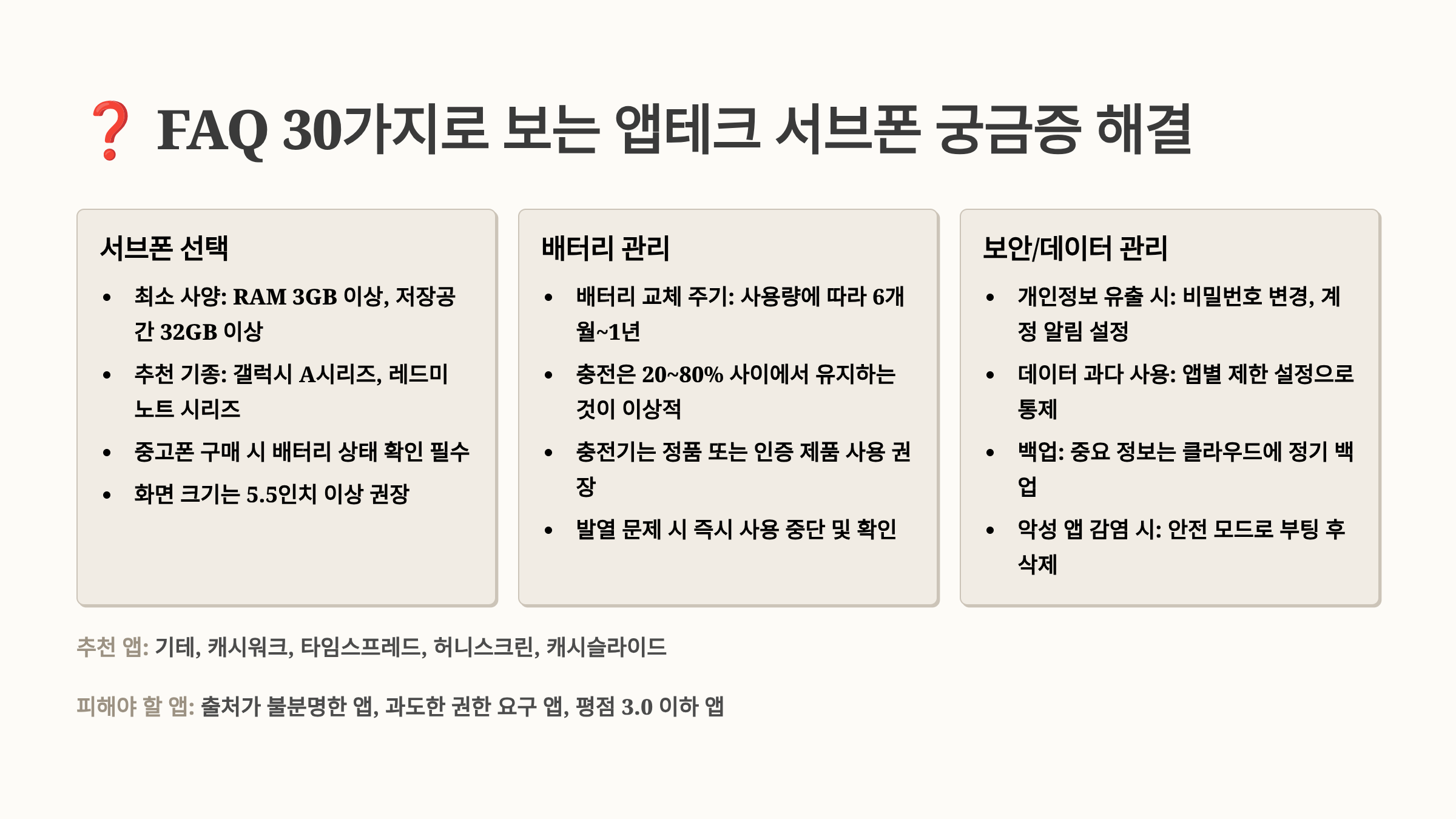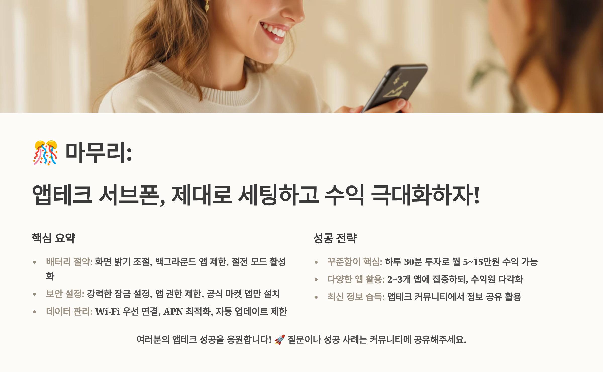지금까지 앱테크 서브폰 최적 설정의 모든 것을 알아봤어요! 💪 배터리 절약부터 보안, 데이터 관리, 성능 최적화까지 제가 실제로 사용하는 모든 노하우를 공개했는데요. 이 설정들만 제대로 적용해도 앱테크 효율이 2배 이상 올라갈 거예요!