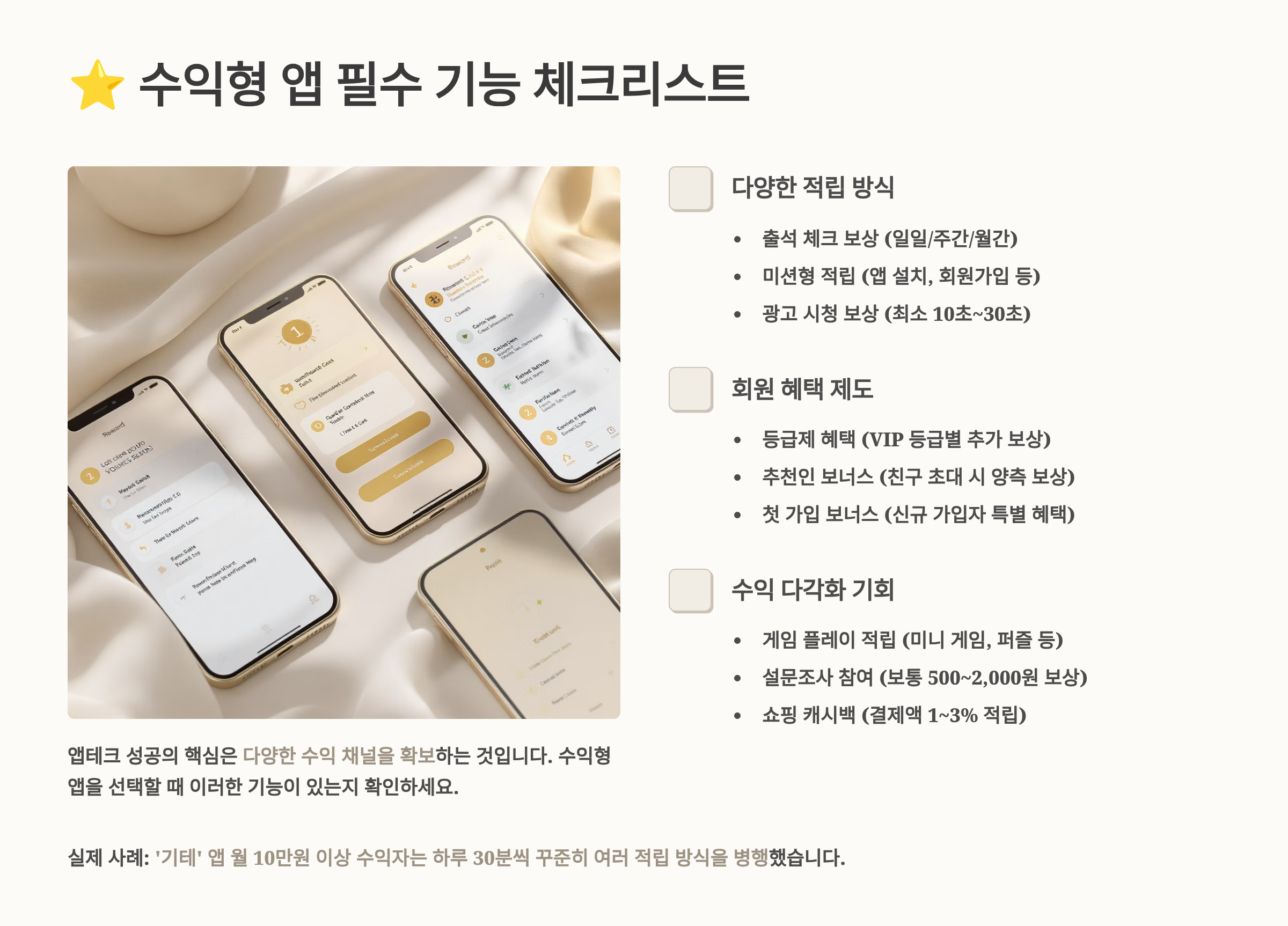 수익형 앱을 선택할 때 어떤 기준으로 고르시나요? 💎 저는 수십 개의 앱을 테스트해보고 진짜 돈이 되는 앱만 추려냈어요. 좋은 수익형 앱은 특정 기능들을 반드시 갖추고 있답니다. 이 체크리스트만 따라도 실패할 확률이 크게 줄어들 거예요!