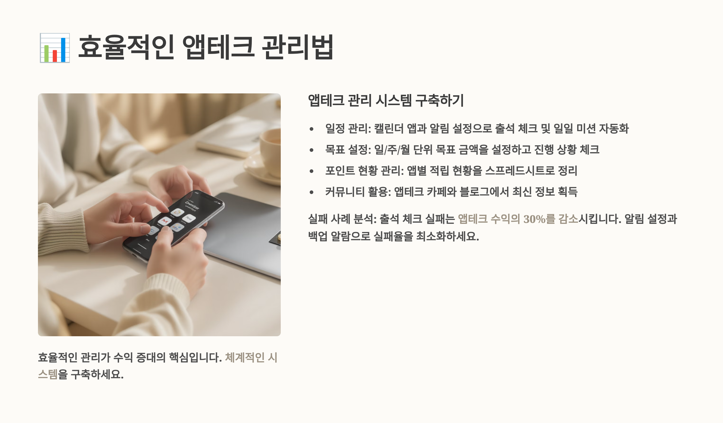 나의 관리 노하우는 '선택과 집중'이에요! 💡 모든 앱을 다 하려고 하지 말고, 가장 효율적인 것만 선택하세요. 시간은 한정되어 있으니까요. 또한 앱테크는 부업이지 본업이 아니라는 걸 잊지 마세요. 적당한 선에서 즐기면서 하는 게 장기적으로 지속 가능해요!