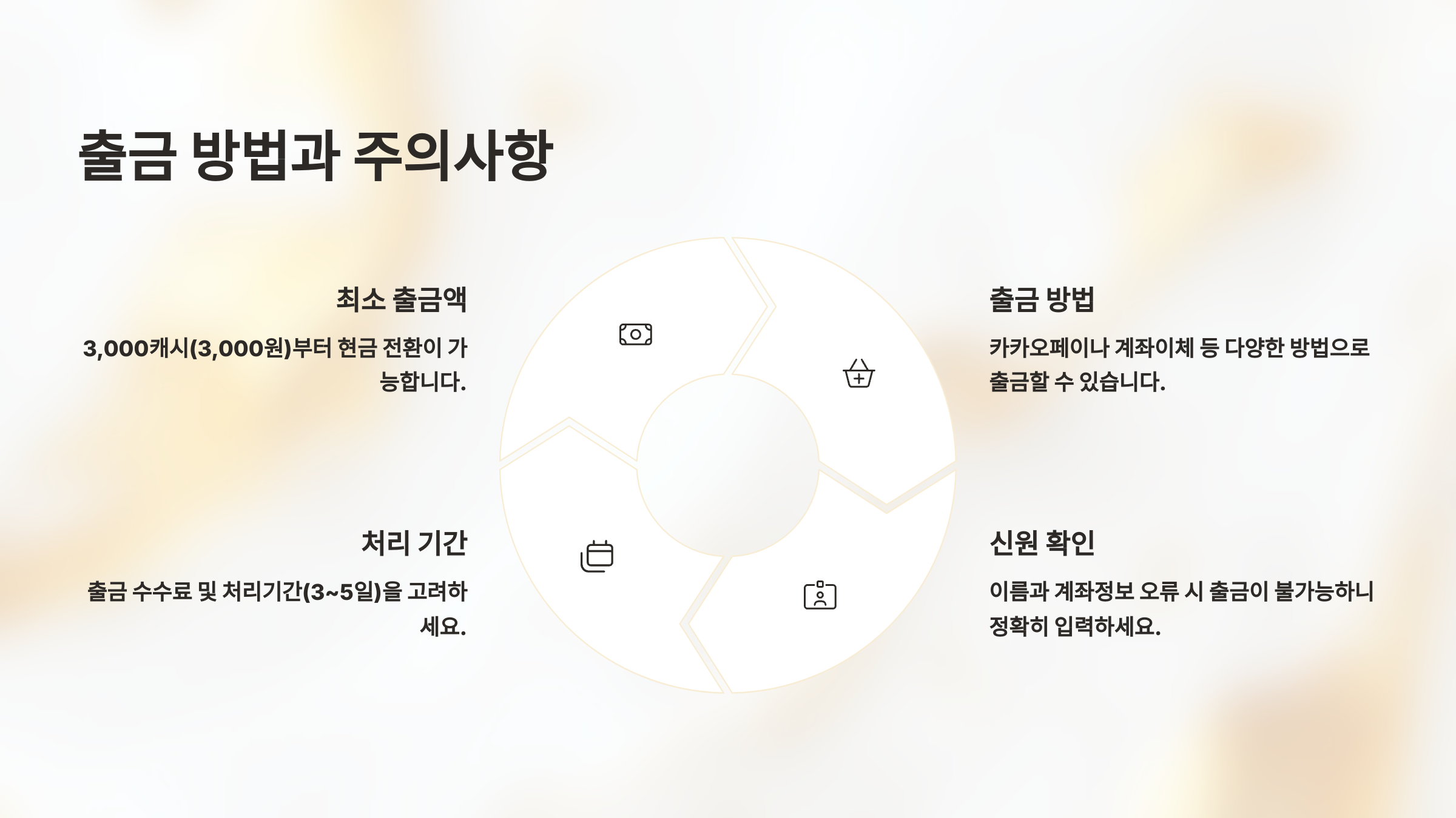 상품권 교환도 인기 있는 옵션이에요. 문화상품권, 해피머니, 도서문화상품권, 스타벅스 상품권, 배스킨라빈스 상품권 등 다양한 종류가 있어요. 상품권의 경우 현금 출금보다 교환 비율이 좋은 경우가 많아서 더 유리할 수 있어요. 예를 들어 5000캐시로 5500원 상당의 상품권을 받을 수 있는 이벤트도 종종 있답니다. 또한 상품권은 즉시 발급되는 경우가 많아서 급하게 필요할 때 활용하기 좋아요. 다만 상품권은 유효기간이 있으니 받고 나서 빨리 사용하는 것이 좋어요.