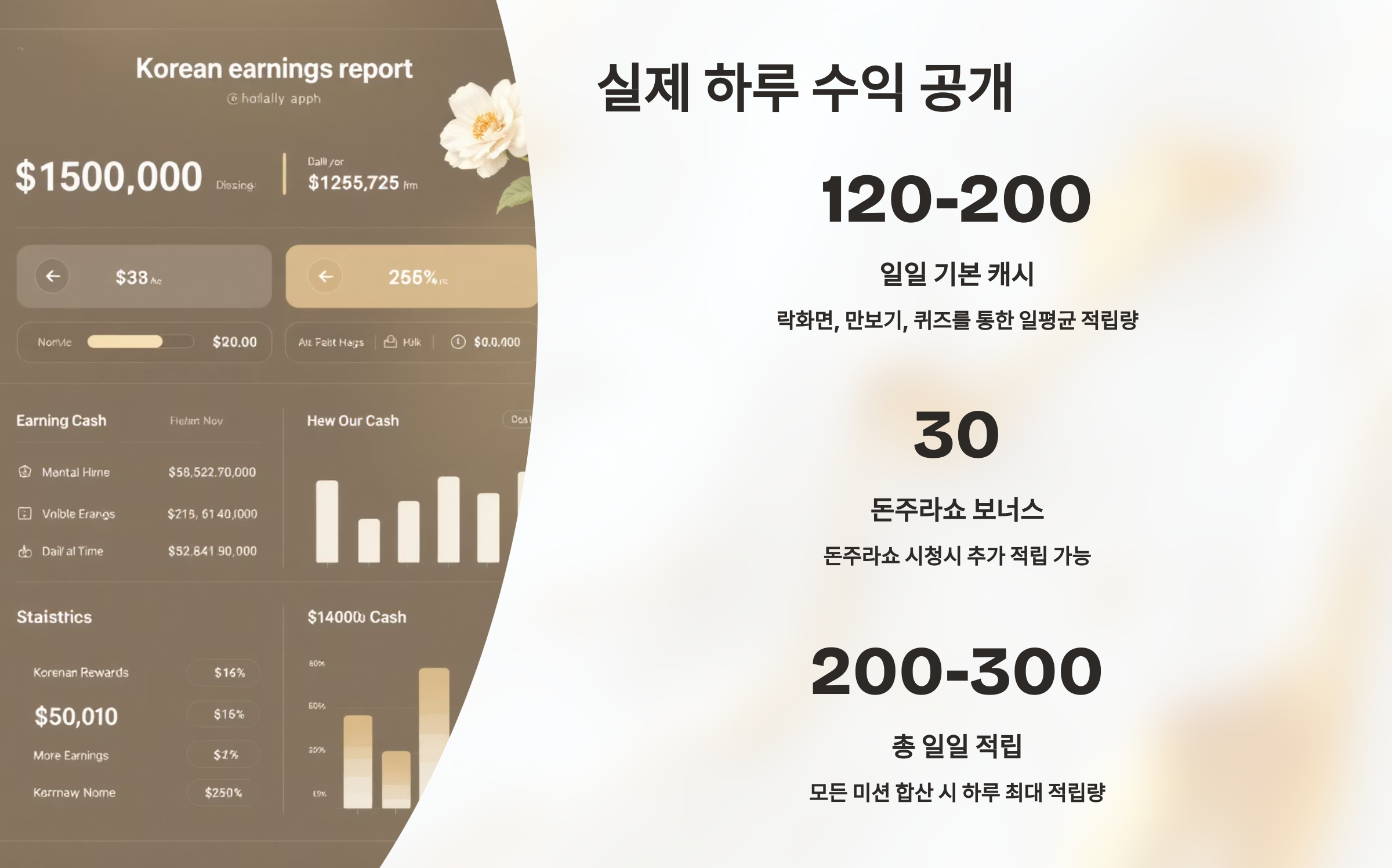 A2. 투자 시간에 따라 다르지만, 1-2시간 정도 사용하면 하루 500-1500캐시(500-1500원) 정도 벌 수 있어요. 고수익 미션이 있는 날에는 더 많이 벌 수도 있어요.