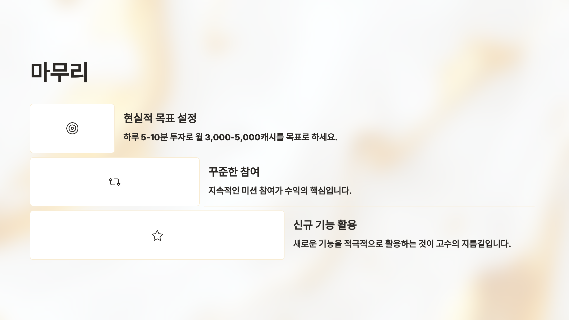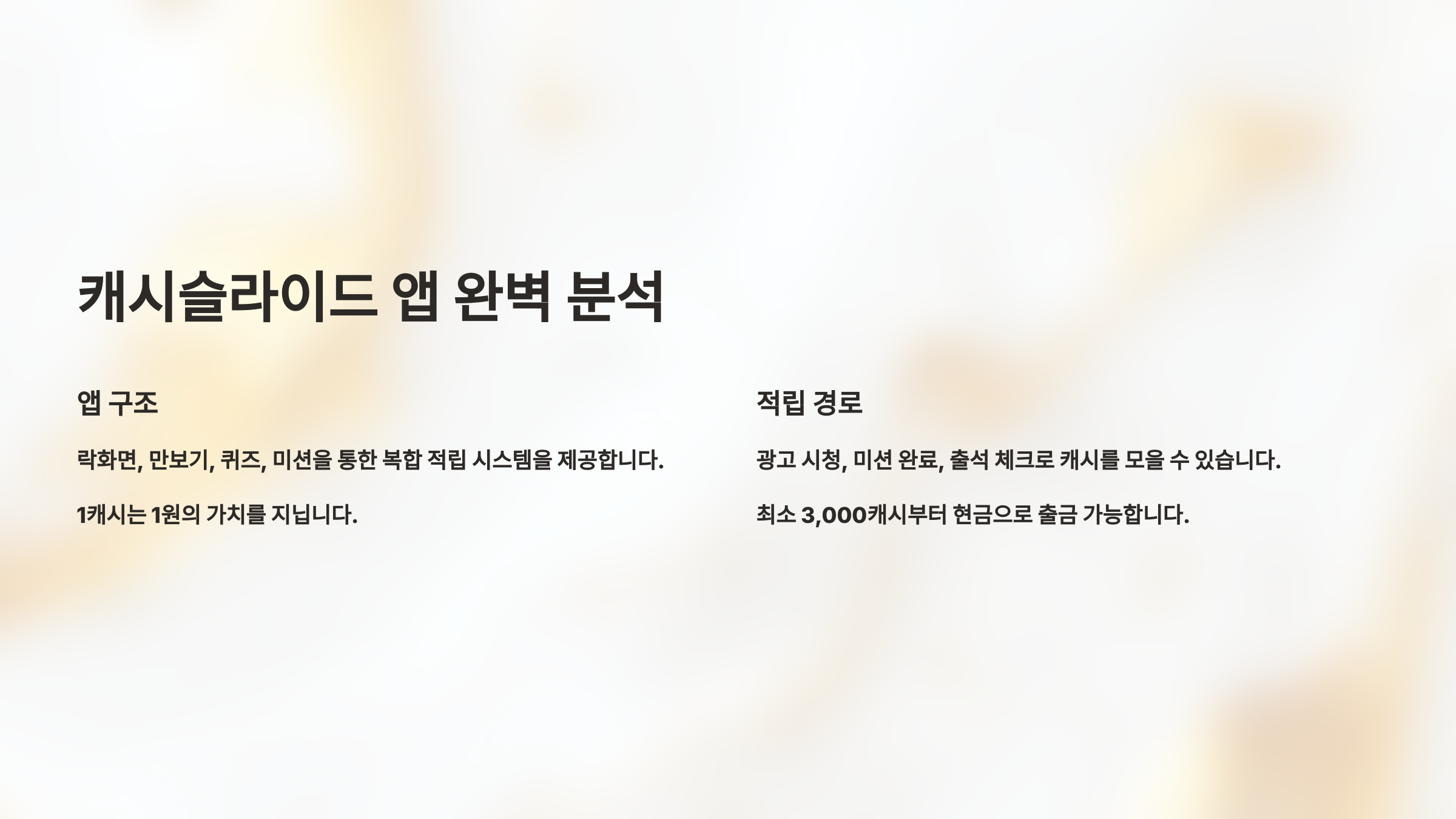 내가 생각했을 때 캐시슬라이드의 가장 큰 장점은 진입 장벽이 낮다는 것이에요. 특별한 기술이나 투자금 없이도 누구나 쉽게 시작할 수 있고, 시간과 장소에 구애받지 않고 미션을 수행할 수 있어요. 하지만 많은 사람들이 단순히 설치만 하고 체계적으로 활용하지 못해서 큰 수익을 얻지 못하는 경우가 많아요. 이 글에서는 캐시슬라이드를 효율적으로 활용해서 실제로 의미 있는 수익을 얻는 방법을 상세히 알려드릴게요!