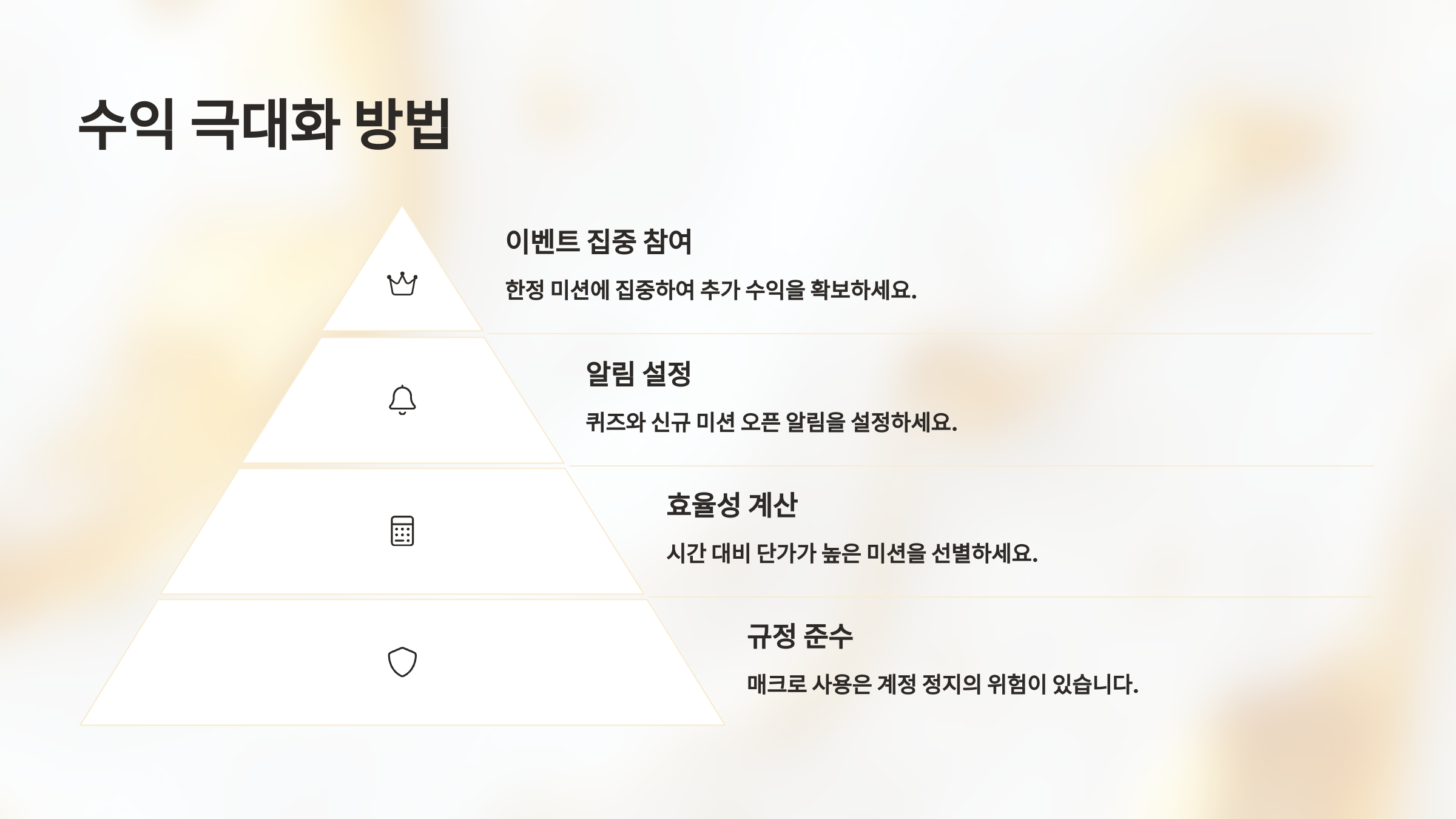 효율적인 적립을 위해서는 본인만의 패턴을 찾는 것이 중요해요. 언제 시간이 많이 나고, 어떤 미션을 선호하는지 파악해서 개인 맞춤형 전략을 세워보세요. 처음에는 작은 금액이어도 꾸준히 하다 보면 상당한 용돈이 될 수 있답니다! 💰