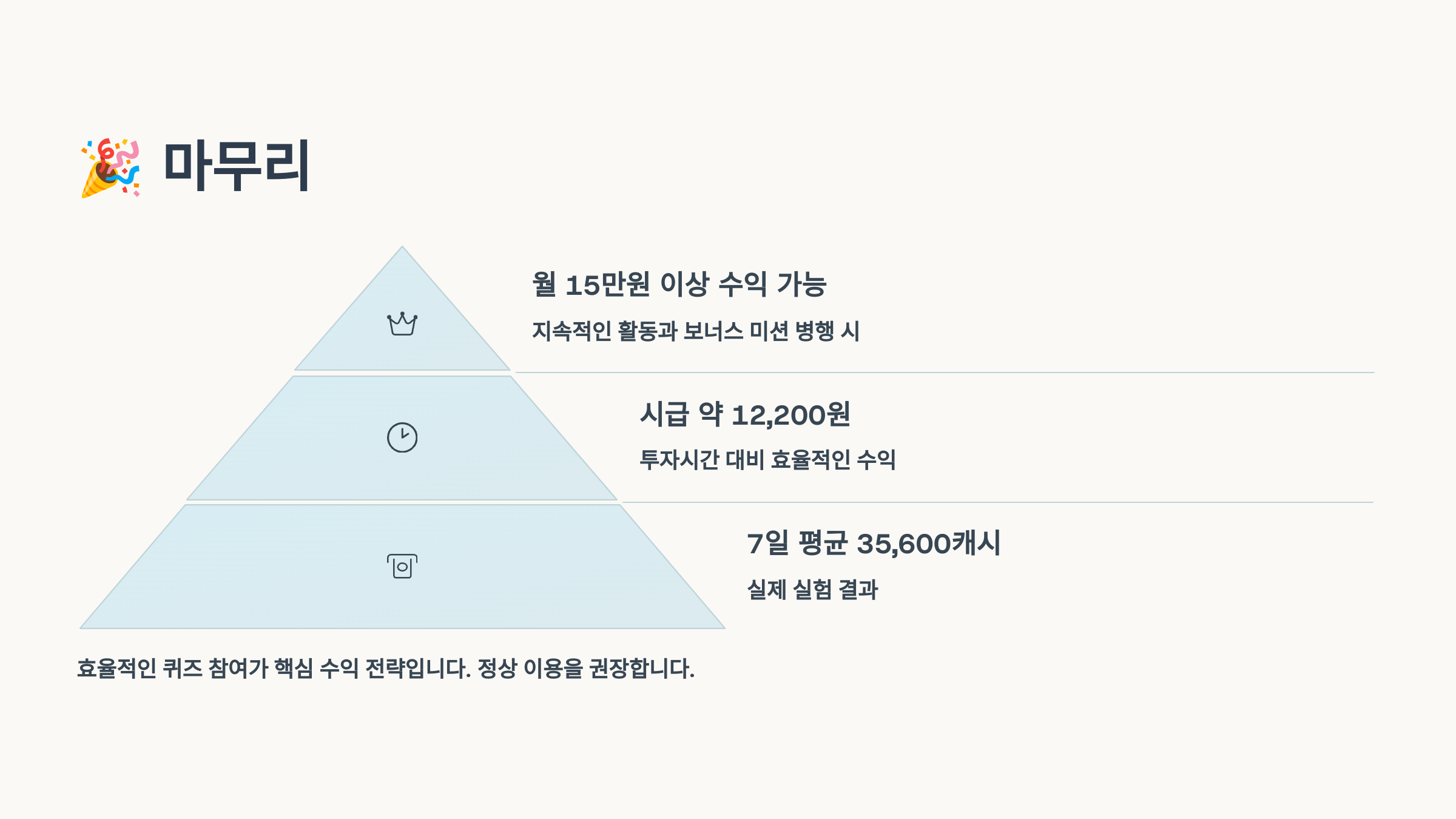 7일간의 캐시워크 수익 실험을 통해 얻은 결론은 꾸준함이 가장 중요하다는 것이에요. 하루에 거대한 수익을 기대하기보다는 매일 조금씩이라도 꾸준히 참여하는 것이 장기적으로 더 큰 수익을 가져다줘요. 실험 기간 동안 총 284포인트를 적립했고, 이를 월 단위로 환산하면 약 1,200원 정도의 수익을 예상할 수 있어요. 더 적극적으로 활동한다면 월 3,000-5,000원까지도 충분히 가능하답니다.