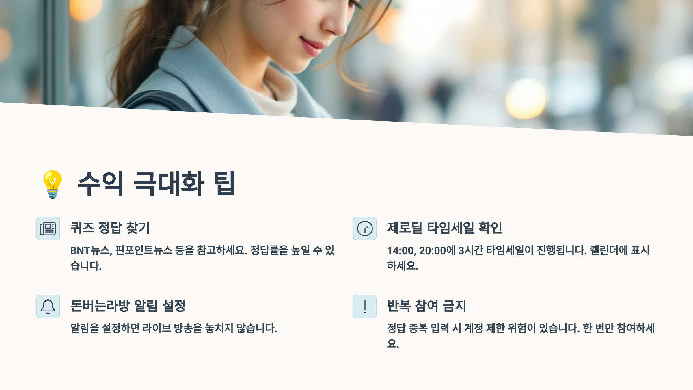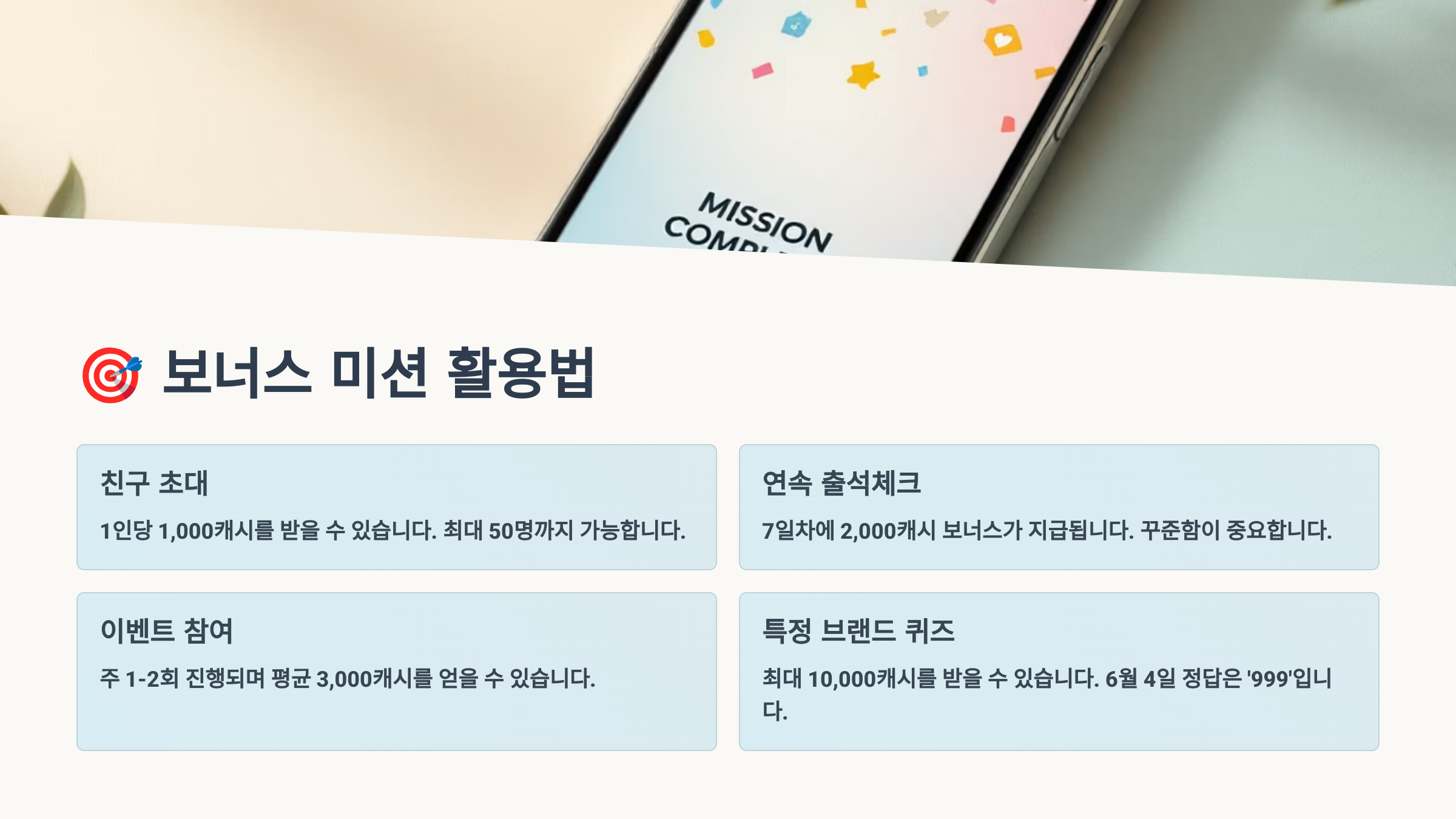 A3. 하루 중 특정 시간대를 정해서 미션을 확인하는 루틴을 만드세요. 아침, 점심, 저녁 3번 정도 앱을 확인하면 대부분의 미션을 놓치지 않고 완료할 수 있어요.