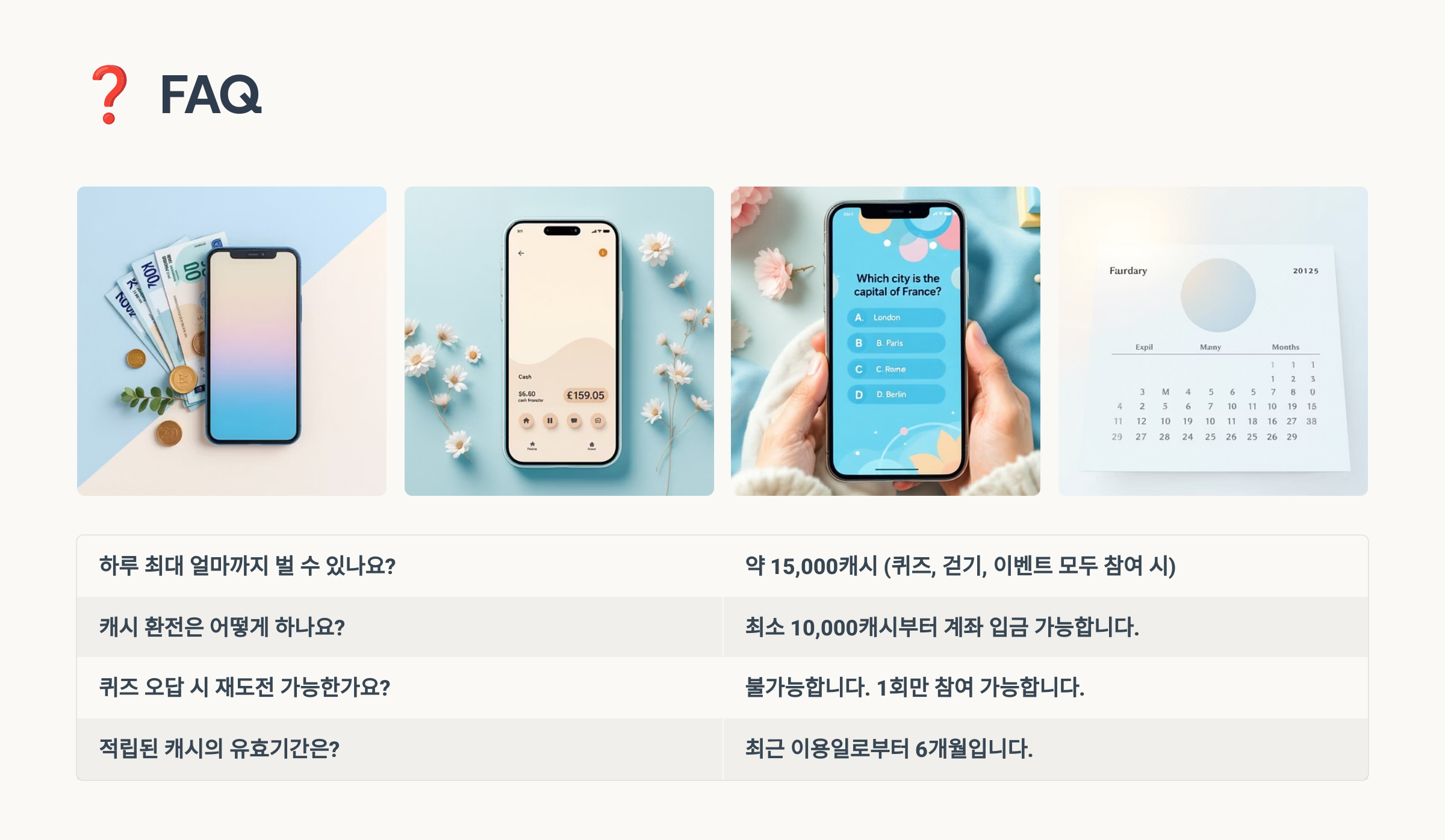 A8. 캐시워크는 정식 등록된 업체에서 운영하는 앱이고, 개인정보 처리방침을 준수하고 있어요. 위치 정보는 걸음수 측정 목적으로만 사용되며, 필요 이상의 정보는 수집하지 않아요.