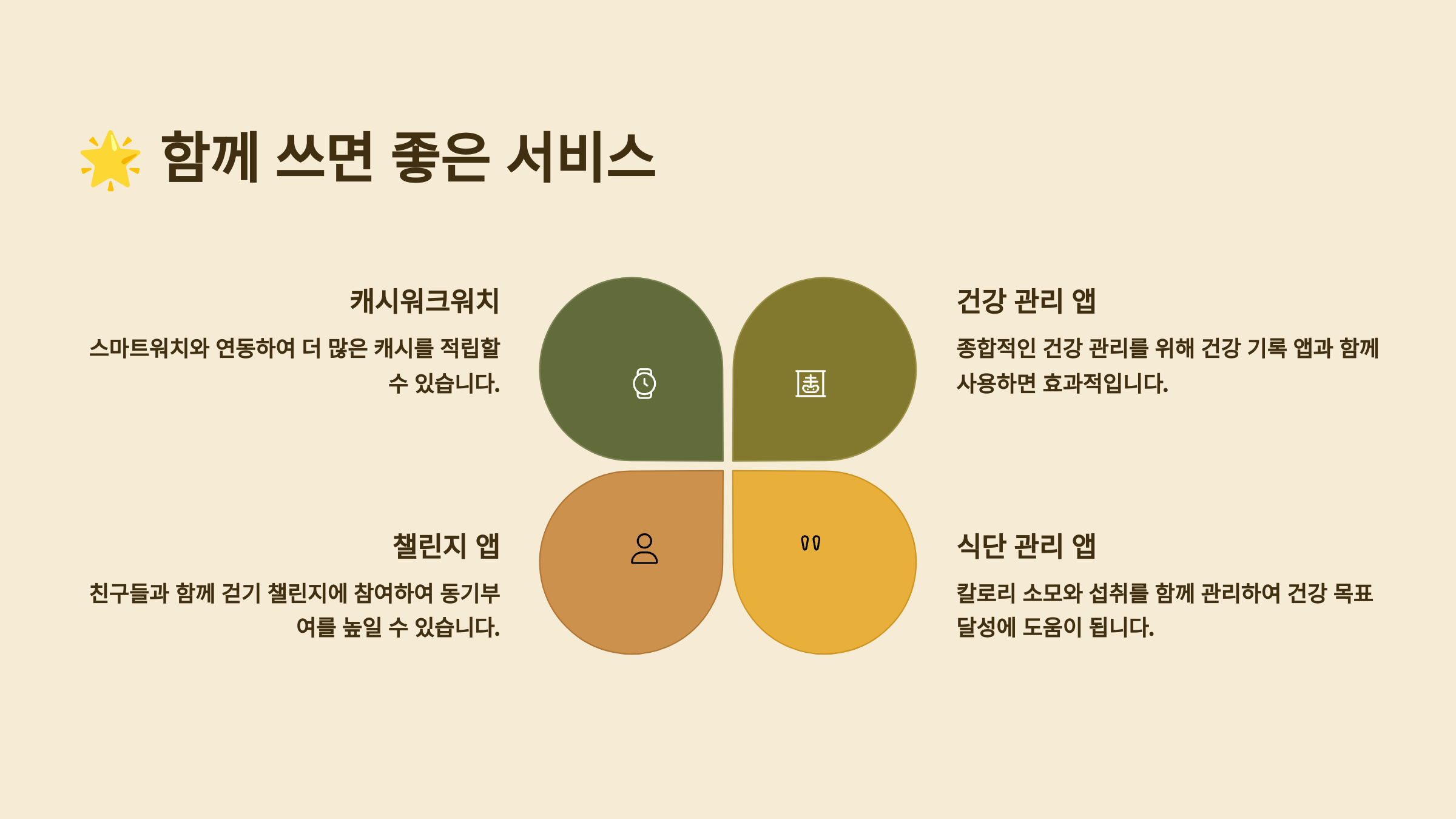 캐시워크와 알람몬 외에도 함께 사용하면 시너지 효과를 낼 수 있는 서비스들이 많아요. 건강도 챙기고 수익도 늘릴 수 있는 다양한 앱과 서비스들을 소개해드릴게요. 이미 걷기 앱을 사용하고 계신다면, 이런 서비스들도 함께 활용해보세요! 🎯