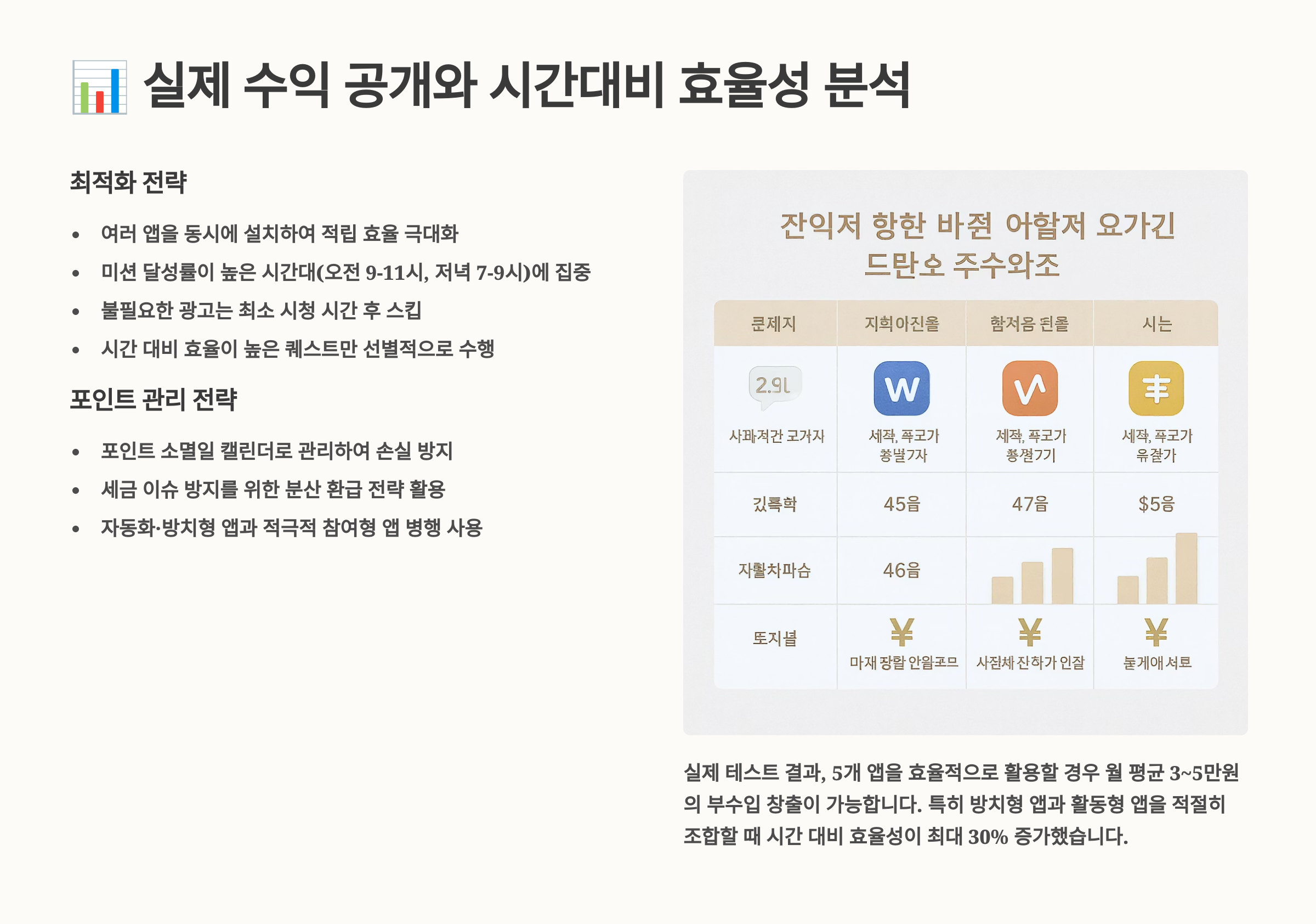 | 시간대 | 추천 활동 | 예상 수익 | 효율성 |