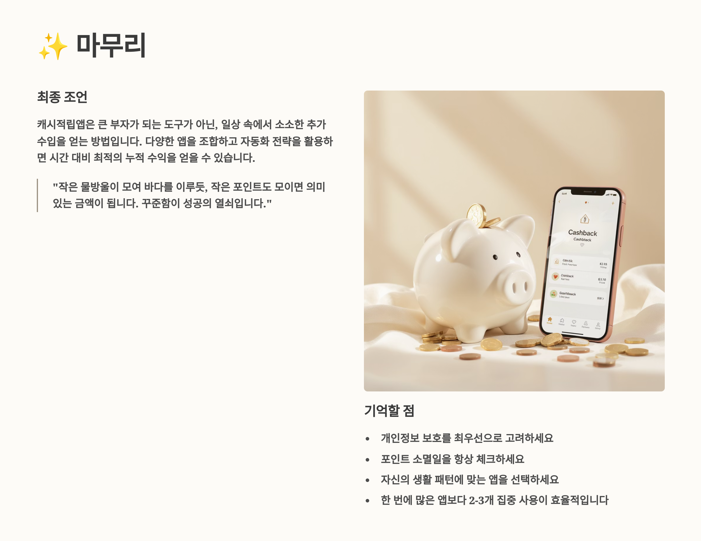 본 글에서 제공하는 정보는 개인의 경험을 바탕으로 작성되었으며, 수익을 보장하지 않습니다. 앱별 정책은 수시로 변경될 수 있으며, 사용 전 최신 이용약관을 확인하시기 바랍니다. 캐시적립앱 사용으로 인한 개인정보 유출이나 금전적 손실에 대해 작성자는 책임지지 않습니다.