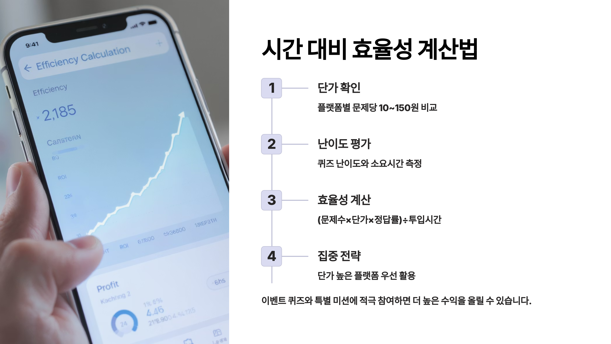 퀴즈 앱테크에서 시간 대비 효율성은 수익성을 평가하는 가장 중요한 지표예요. 단순히 많은 문제를 푸는 것보다 효율적으로 시간을 활용하는 것이 장기적으로 더 높은 수익을 가져다줘요. 시간당 수익률을 계산하는 공식은 간단해요. (총 획득 포인트 ÷ 소요 시간) × 60 = 시간당 수익이에요. 이 수치를 기준으로 어떤 앱이나 문제 유형이 더 효율적인지 판단할 수 있어요.