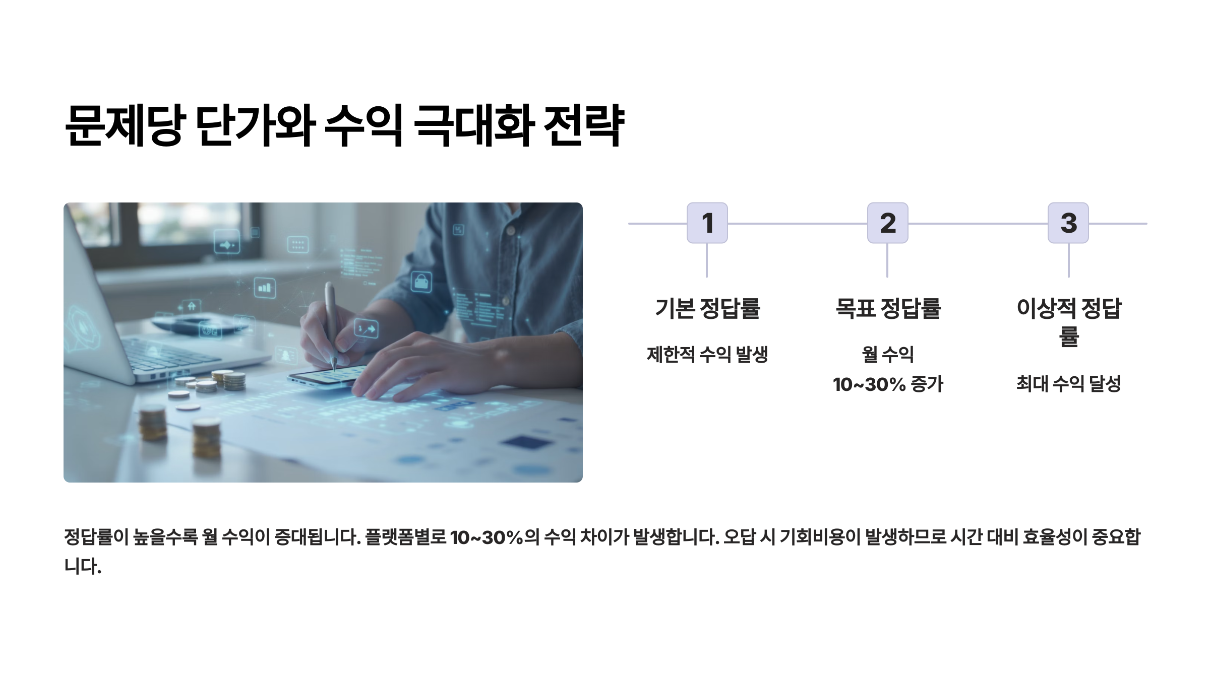 단가와 시간 효율성의 균형을 맞추는 것도 중요해요. 단가가 100원인 문제라도 풀이 시간이 10분이 걸린다면, 단가 30원짜리를 1분에 푸는 것보다 효율이 떨어져요. 그래서 시간당 수익률을 계산해서 전략을 세우는 것이 필요해요. 일반적으로 시간당 2,000원 이상의 수익률을 목표로 하는 것이 좋고, 이를 위해서는 문제 선택과 풀이 속도 향상에 신경 써야 해요.