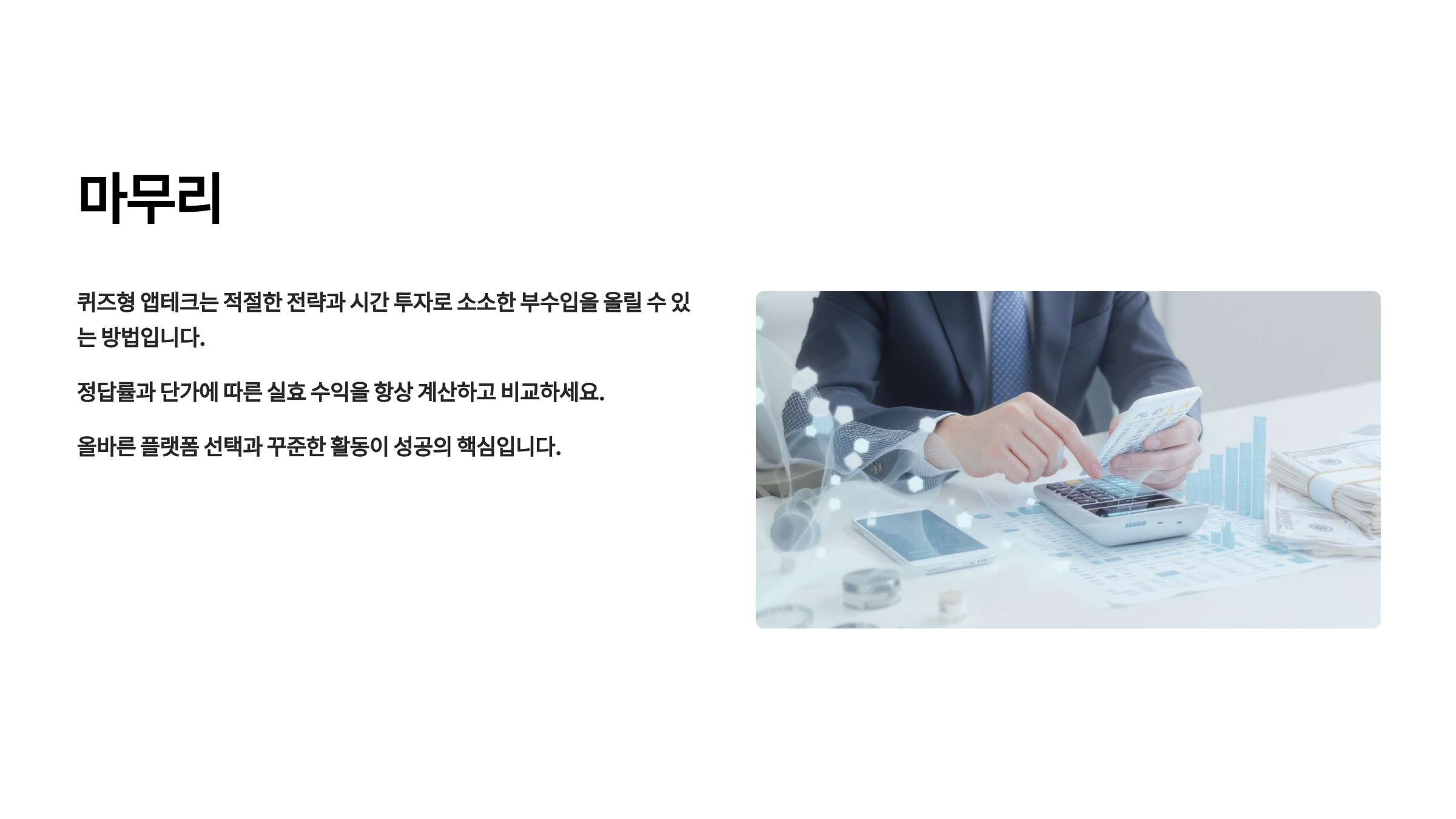 지금까지 퀴즈형 앱테크의 수익 구조부터 실전 전략까지 상세히 알아봤어요. 퀴즈 앱테크는 적은 시간 투자로도 꾸준한 부수입을 만들 수 있는 좋은 방법이지만, 체계적인 접근과 전략이 필요해요. 정답률과 문제당 단가를 고려한 효율적인 운영, 시간대별 최적화, 그리고 여러 앱을 병행하는 포트폴리오 전략까지 활용하면 월 10만원 이상의 수익도 충분히 가능하답니다.