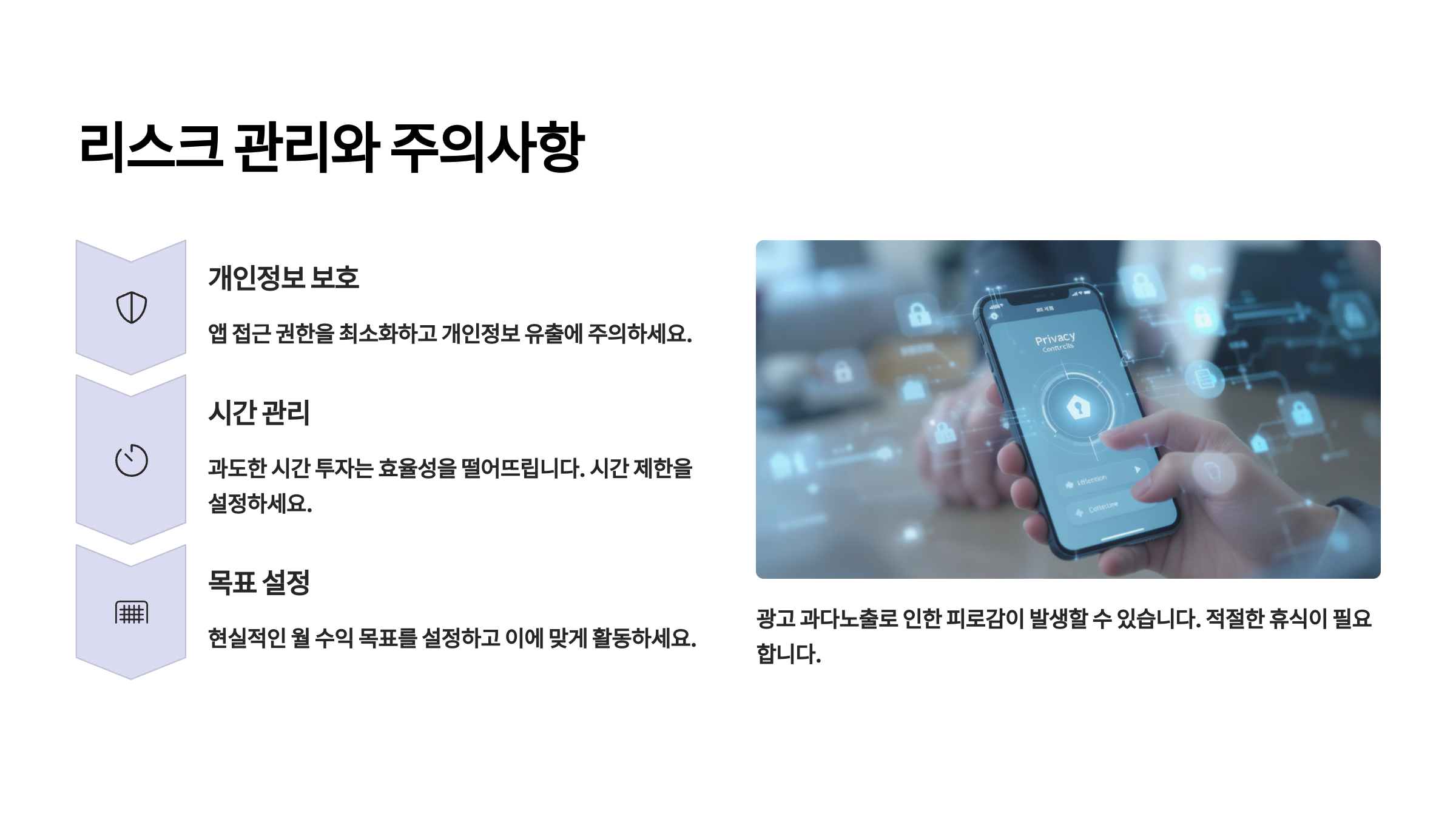 퀴즈 앱테크도 다른 부업처럼 주의해야 할 점들이 있어요. 가장 중요한 것은 '과도한 시간 투자 방지'예요. 수익에 욕심이 나서 하루 종일 퀴즈만 푸는 경우가 있는데, 이는 시간당 효율성을 떨어뜨리고 번아웃을 유발할 수 있어요. 전문가들은 하루 1~2시간 정도가 적정하다고 조언해요. 이 시간 동안 집중해서 효율적으로 활동하는 것이 장기적으로 더 높은 수익을 가져다준답니다.