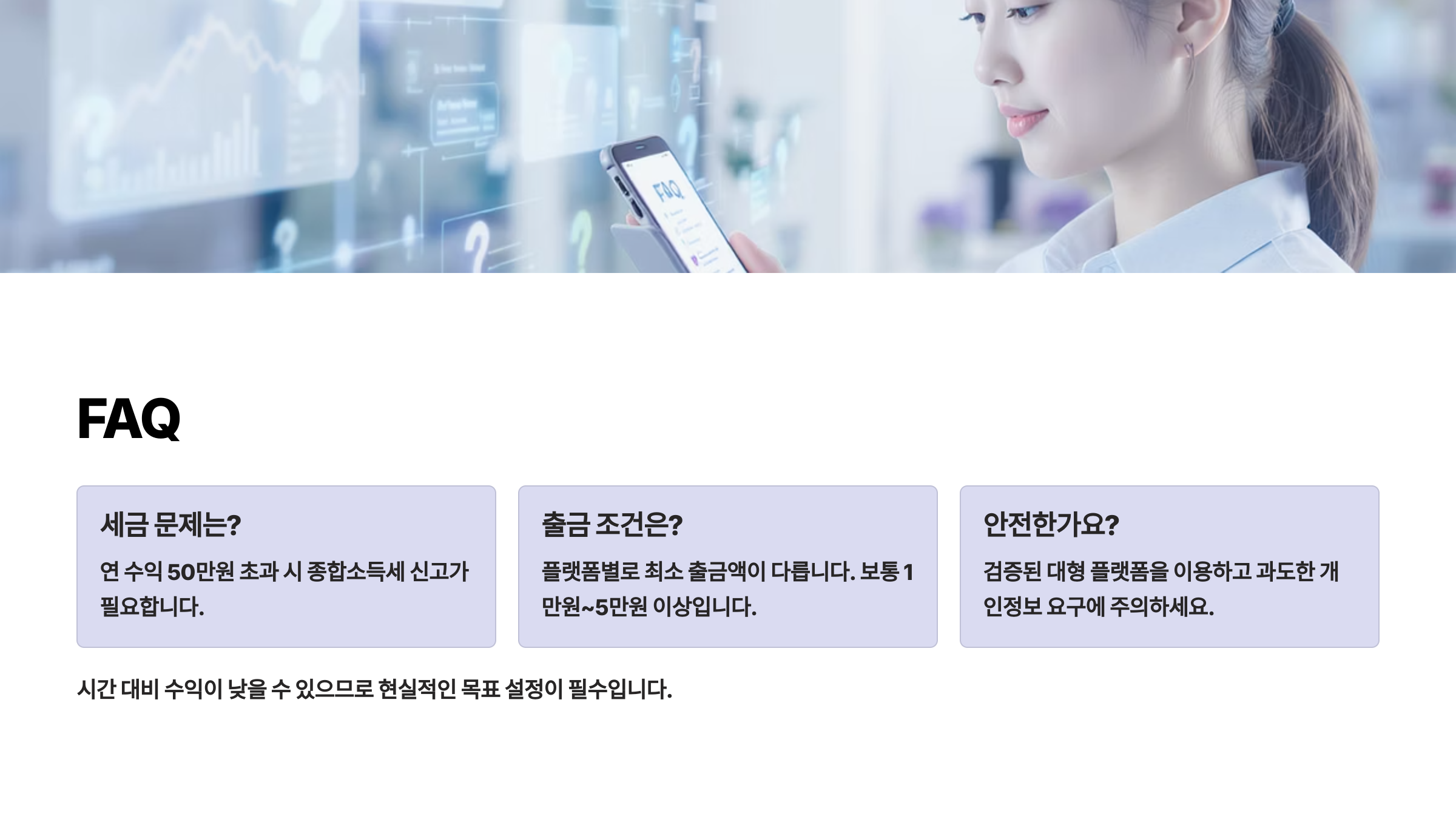 A5. 연간 수익이 300만원을 초과하면 기타소득으로 신고해야 해요. 대부분의 일반 사용자는 이 금액에 미달하지만, 여러 앱을 병행해서 수익이 많다면 세무 상담을 받아보는 것이 좋아요.