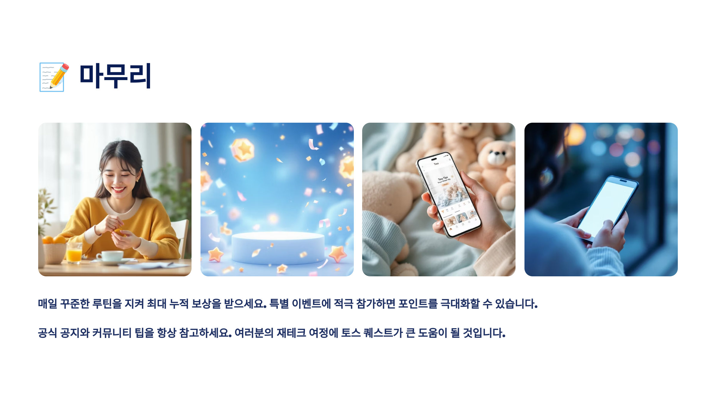 토스 퀘스트는 일상 생활 속에서 자연스럽게 포인트를 적립할 수 있는 훌륭한 시스템이에요. 처음에는 복잡해 보일 수 있지만, 한 번 요령을 터득하면 매우 간단하고 효율적으로 활용할 수 있답니다. 중요한 것은 꾸준함이에요. 하루에 많은 퀘스트를 몰아서 하기보다는 매일 조금씩이라도 꾸준히 하는 것이 더 큰 성과를 가져다줘요.