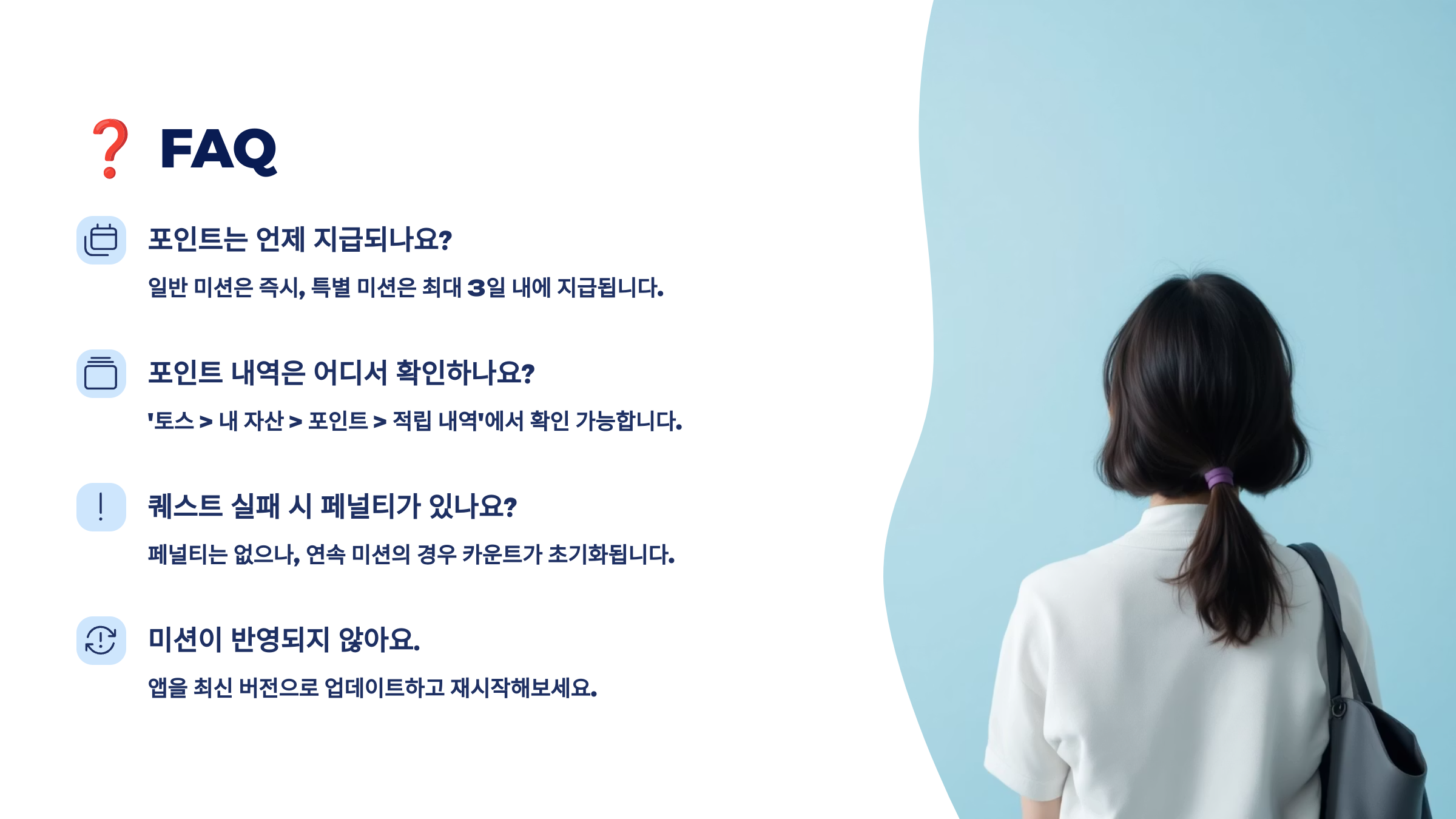 A2. 포인트는 보통 퀘스트 완료 후 즉시 또는 몇 분 내에 지급돼요. 만약 30분 이상 지연된다면 고객센터에 문의해보세요.