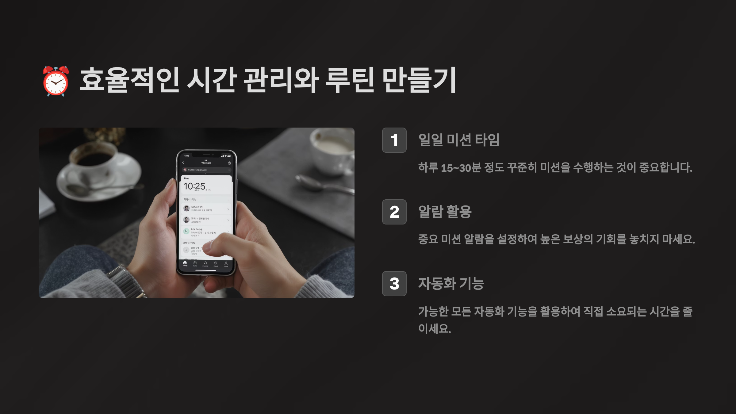 | 06:00-07:00 | 출석체크, 일일미션 | 알람 설정으로 습관화 |