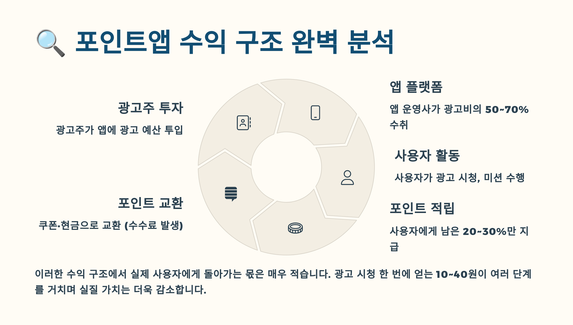 포인트앱 회사들의 수익 구조를 이해하면 왜 이렇게 적은 보상을 주는지 알 수 있어요. 광고주가 포인트앱 회사에 지불하는 광고비 중에서 앱 회사가 70-80%를 가져가고, 나머지 20-30%만 사용자들에게 분배해요. 예를 들어 광고주가 1,000원을 지불했다면, 사용자는 200-300원만 받는 거죠. 여기에 서버 운영비, 인건비 등을 제외하면 사용자 몫은 더 줄어들어요. 😔
