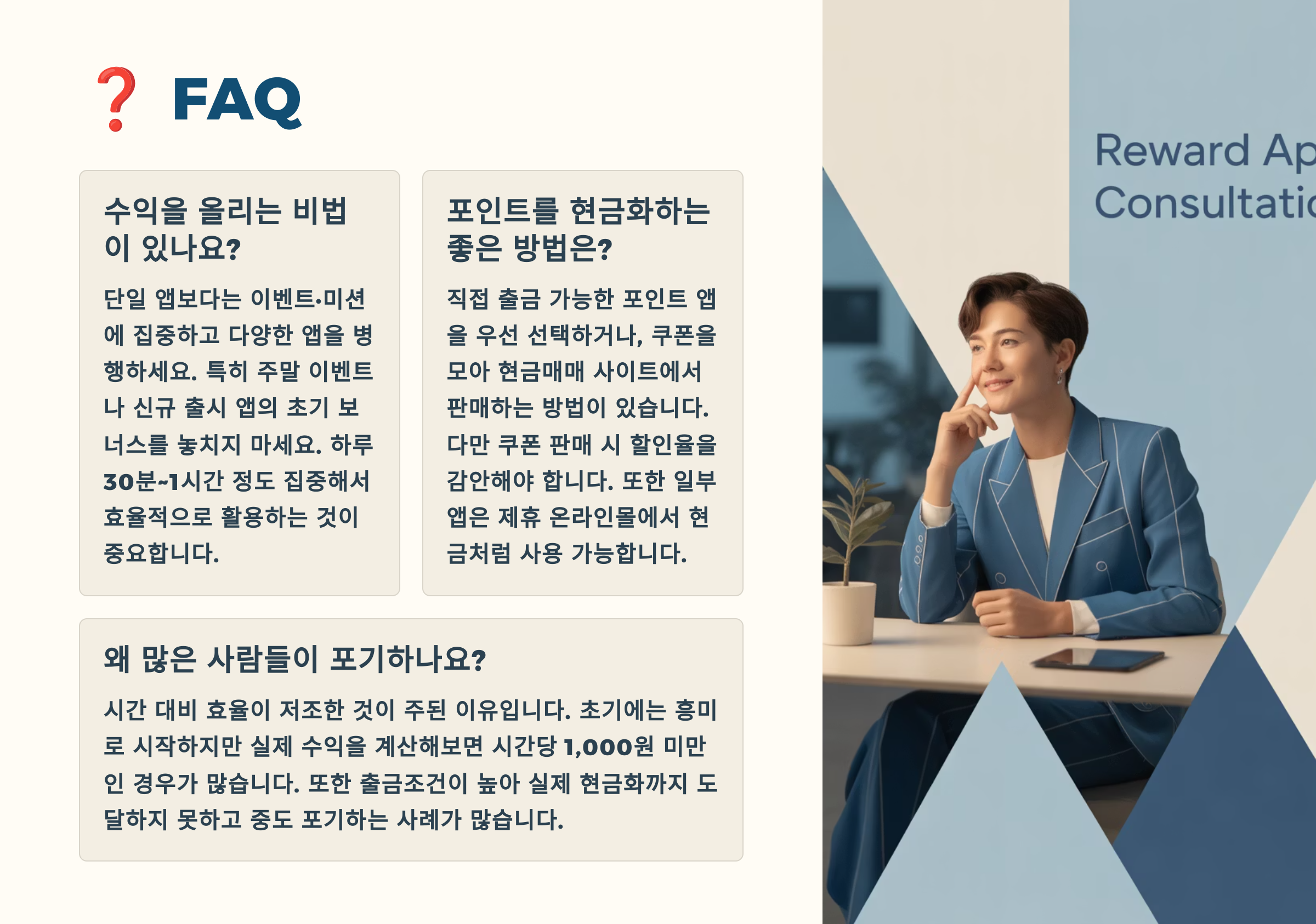 물론 모든 포인트앱이 나쁘다는 건 아니에요. 정말 할 일이 없는 자투리 시간에, 큰 기대 없이 가볍게 한다면 괜찮을 수도 있어요. 하지만 이것을 부업이라고 생각하거나, 월 수십만 원을 벌 수 있다고 기대하는 건 위험해요. 현실적인 기대치를 가지고, 시간을 제한해서 사용하는 게 중요해요.