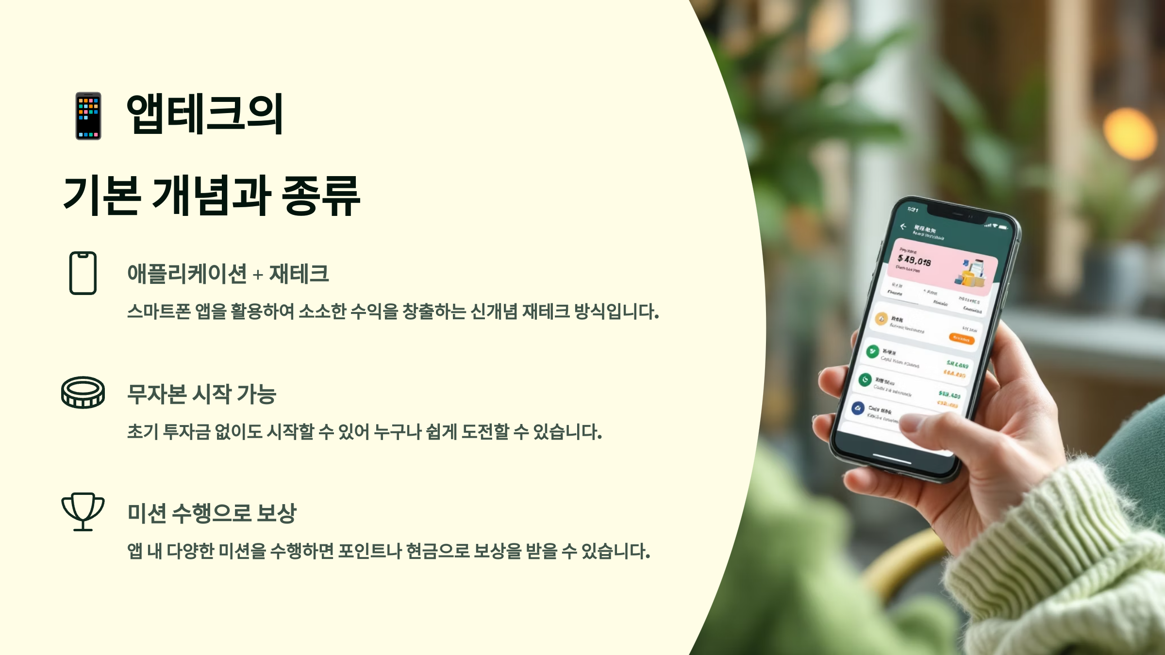 앱테크는 'Application'과 'Technology'의 합성어로, 스마트폰 애플리케이션을 활용해 수익을 창출하는 활동을 의미해요. 2020년부터 본격적으로 대중화되기 시작했으며, 코로나19로 인한 비대면 문화 확산과 함께 급속도로 성장했답니다. 현재 국내에만 100개 이상의 앱테크 관련 애플리케이션이 서비스되고 있어요.