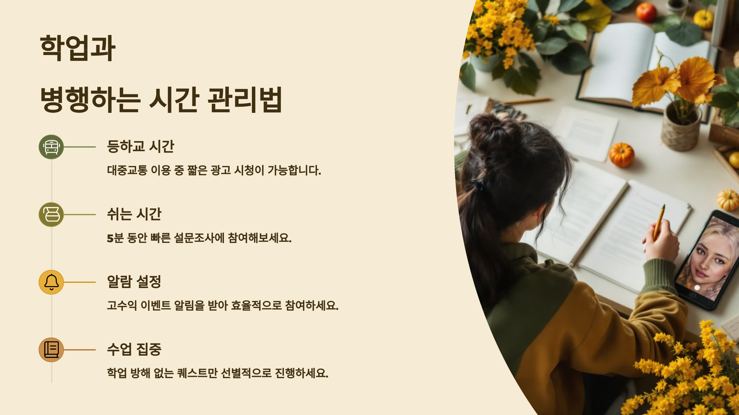 학업과 앱테크의 균형을 잘 맞추면 스트레스 없이 꾸준한 수익을 올릴 수 있어요. 무엇보다 학생으로서의 우선순위를 잊지 않는 것이 가장 중요하답니다! 📚