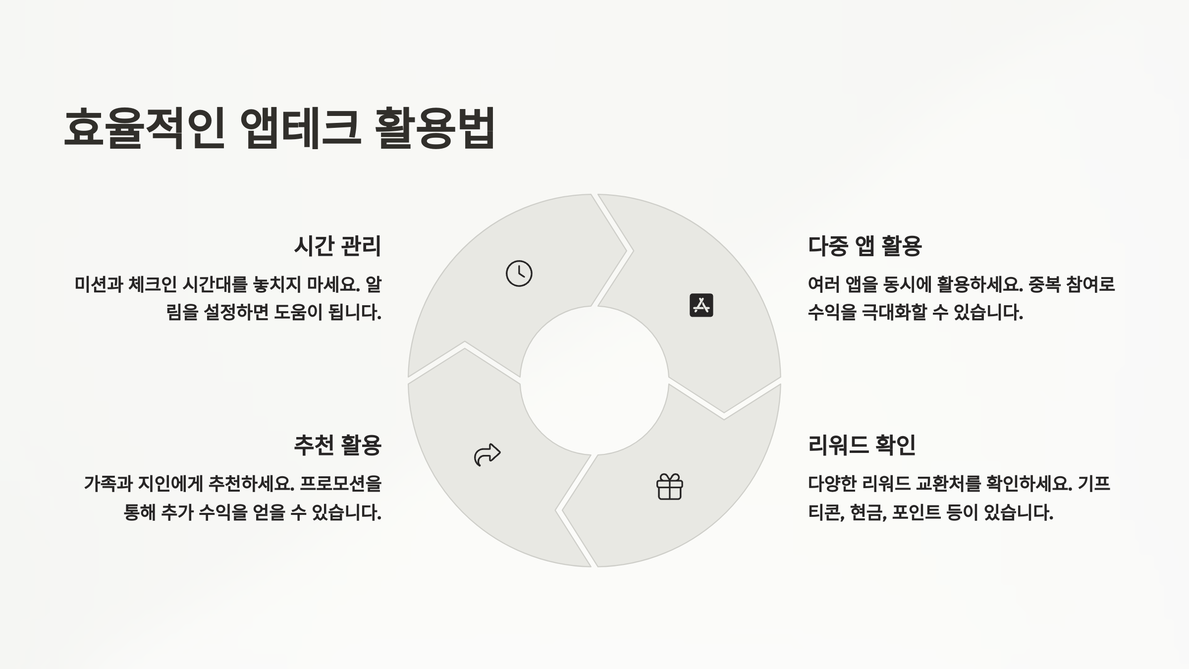 효율적인 앱테크의 핵심은 일상생활에 자연스럽게 녹여내는 거예요. 별도의 시간을 내지 않고도 기존 활동에 앱테크를 더하는 방식으로 접근하면 부담 없이 꾸준히 할 수 있어요! 💫