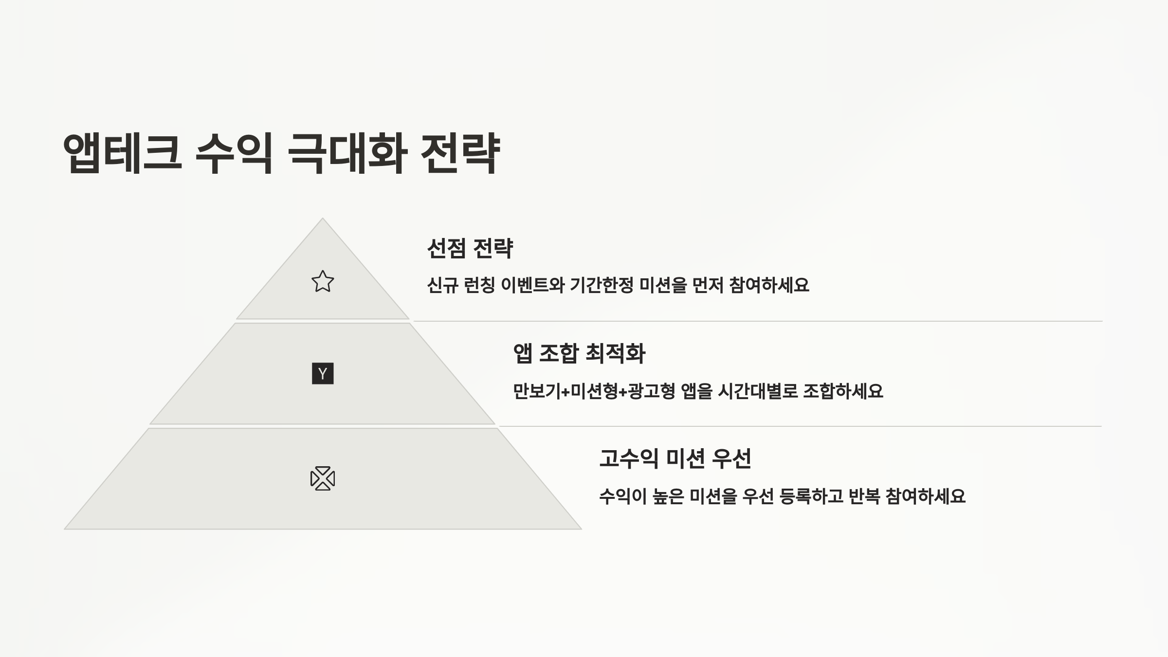 앱테크 수익을 극대화하려면 전략적 접근이 필요해요. 가장 효과적인 방법은 피라미드 전략인데, 기본 수익을 보장하는 안정형 앱 3-4개를 기반으로 하고, 그 위에 고수익이 가능한 도전형 앱 2-3개를 추가하는 방식이에요. 안정형 앱으로는 캐시워크, 허니스크린, 토스 같은 앱들이 있고, 도전형 앱으로는 투자형 앱테크나 블록체인 기반 앱들이 있어요. 이렇게 포트폴리오를 구성하면 안정적인 기본 수익과 높은 추가 수익을 동시에 추구할 수 있어요.